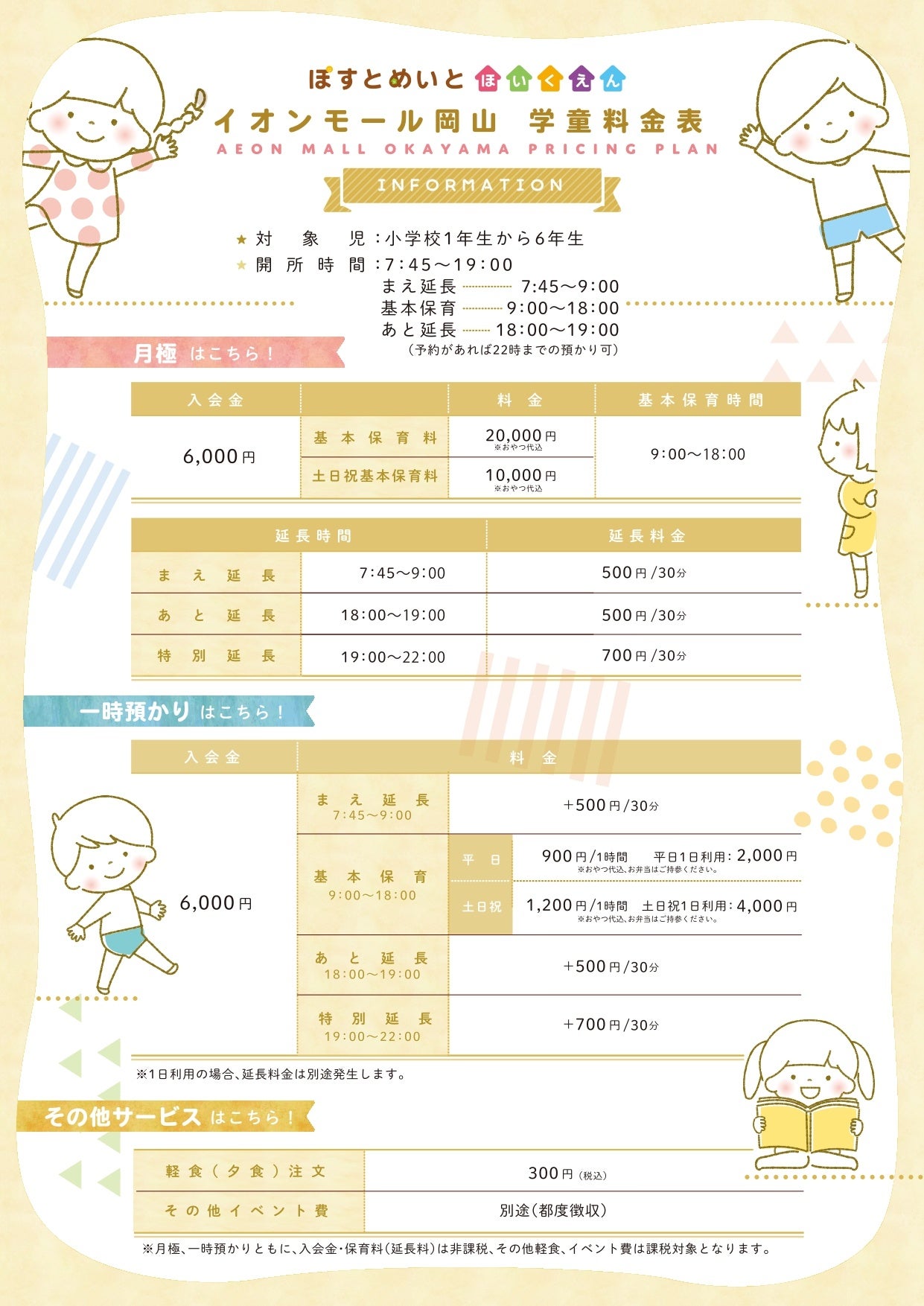 昨今、共働き世帯の増加に伴い、岡山市においても令和5年5月1日時点における放課後児童クラブの待機児童数は193名となっており、年々右肩上がりな状況です(※1)。岡山市の重要課題ともいえる待機児童解消にいちはやく貢献するべく、イオンモール岡山内にて運営している「ポストメイト保育園・イオンモール岡山」において、学童保育の定期利用コースを新設いたします。