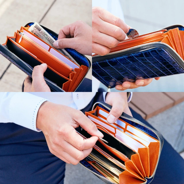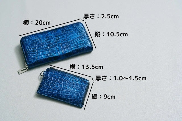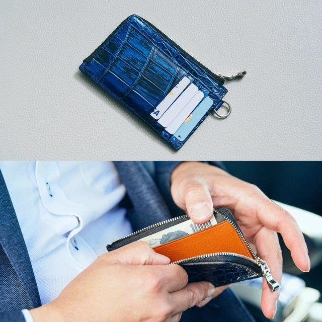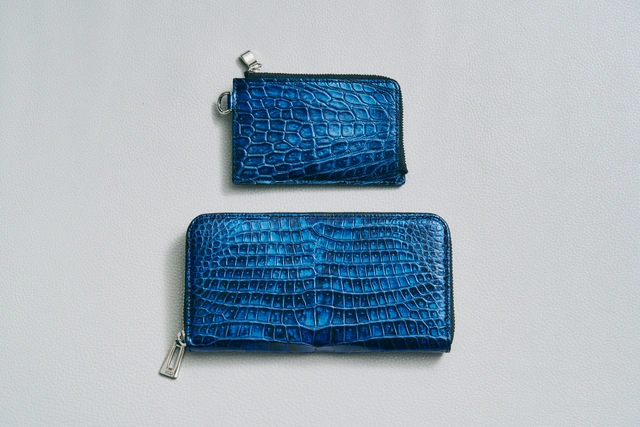 高級クロコダイル革と経年変化が楽しめるイタリア製の牛ヌメ革を活かした使い易いラウンドファスナー束入れとジップカードホルダーです。夜空のイメージを国内優秀の染め加工職人が丁寧に手加工で表現しています。