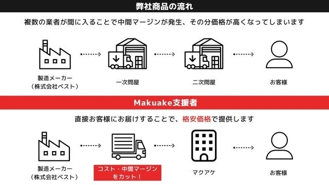 メーカーとの協力により直接お客様へ配送し、コストと中間マージンを削減しました。そうすることで格安価格で提供でき、圧倒的なコストパフォーマンスを実現することができました。