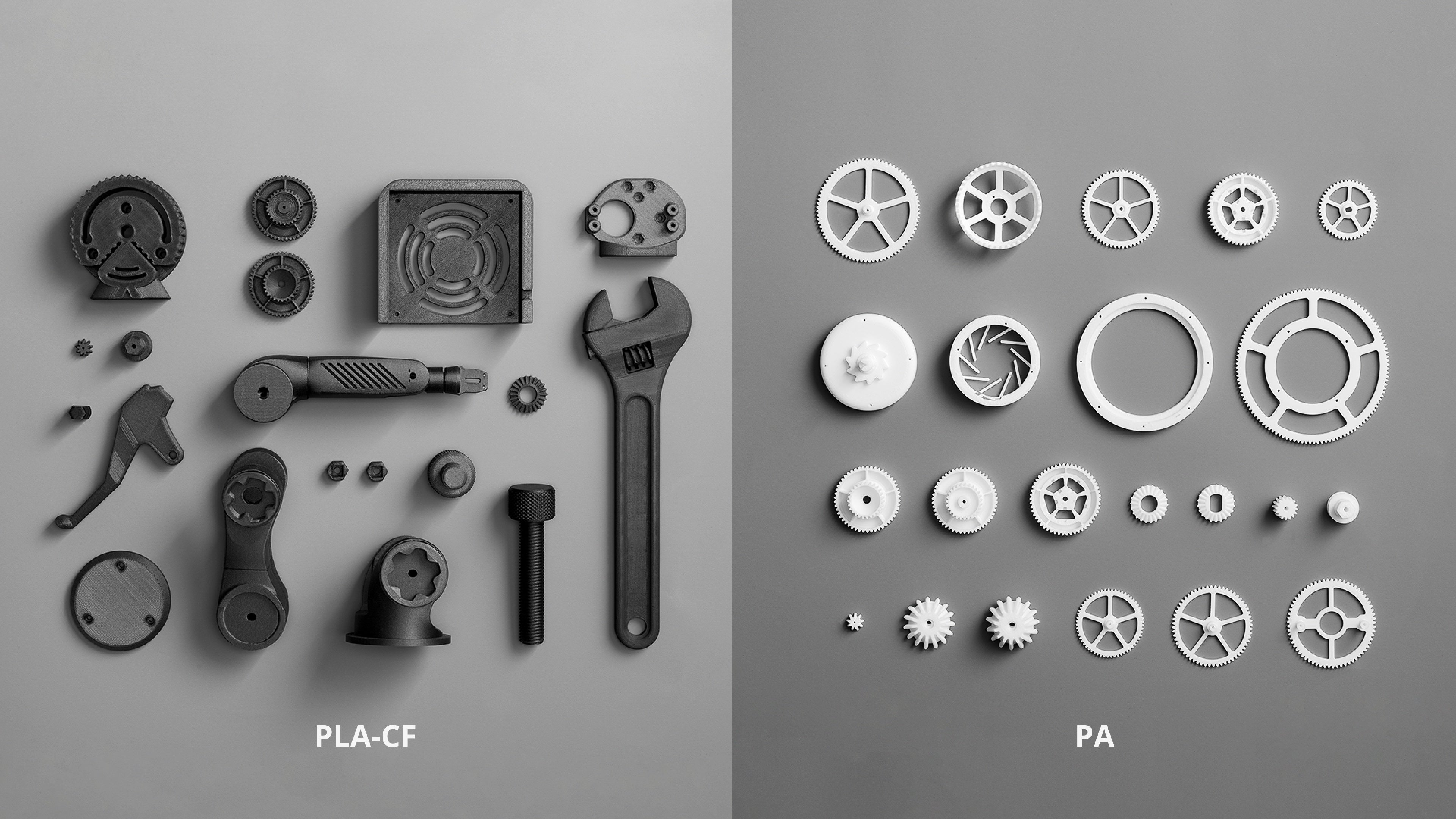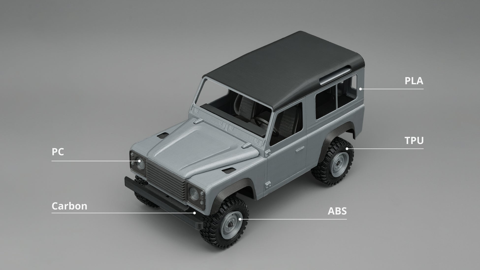 低温で簡単に印刷できるPLAやPETGに加え、量産にも向けるカーボン/ガラスファイバー入りの素材やABSなども幅広い素材を造形できます