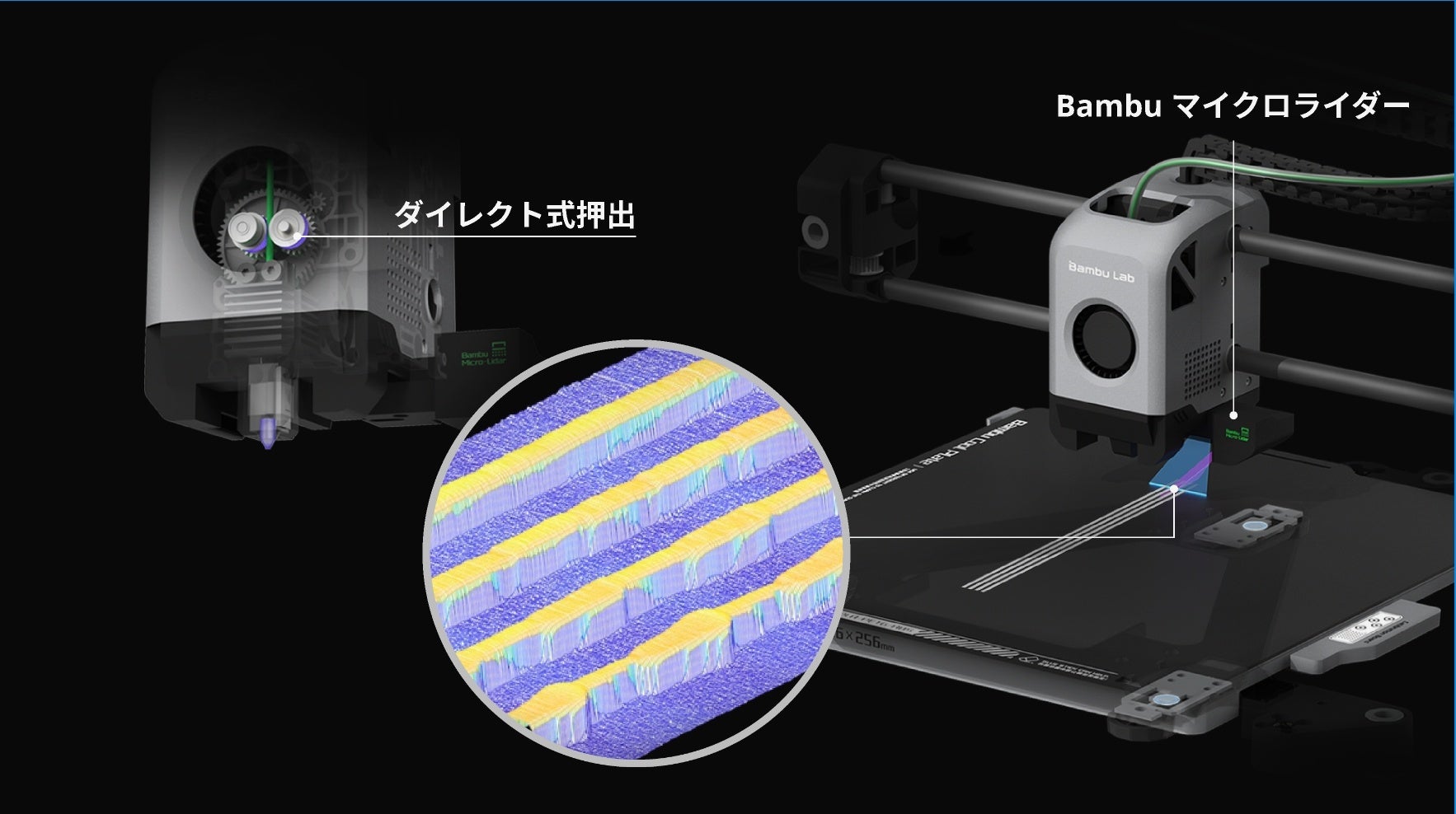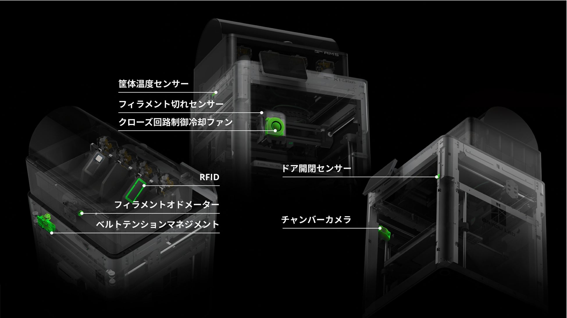 Bambu Labのプリンターは最先端なライダーシステムに加え、数々のセンサーを備えています。こういうシステムにより、今まで主流なプリンターによくあった1層目品質問題、スパゲティ問題、フィラメント切れ問題、ベッドレベリング問題などなどを自動で検出でき、フィラメントの無駄、時間の浪費を防げます