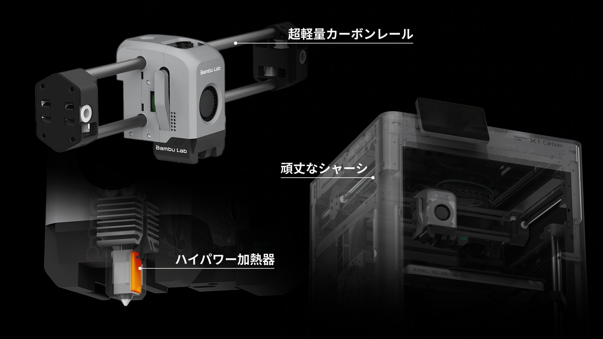 主流の3Dプリンターによくあるベッドスリンガー式と違い、Bambu LabのプリンターはCoreXY式を採用し、またカーボンレールの超軽量作動部、高パワーの加熱器により、最大移動速度500 mm/s と最大流量32 mm3/sを実現できました。