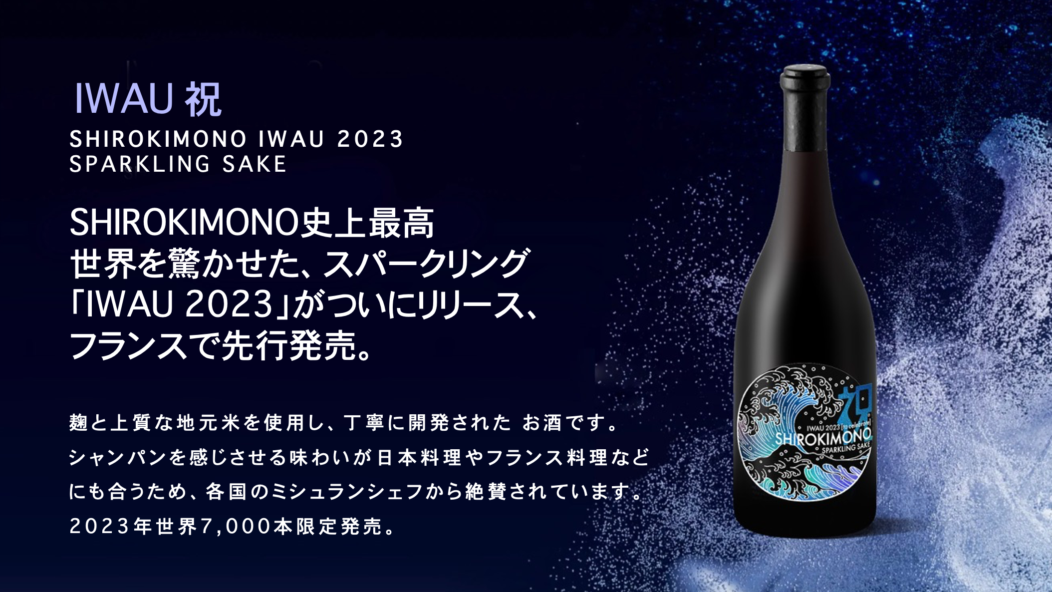 2022年にフランスのクローズドマーケットから販売を開始。パリで世界トップクラスのソムリエや、ミシュランシェフなどを驚かせたスパークリングSAKE『IWAU』は、白麹を贅沢に使用する独自の製法で、高級感のある香りと酸味が引き立ち、今までに体験したことのない新しい日本酒の世界を体験できると話題になった。