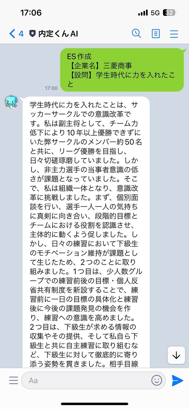 チャットに【企業名】、【設問】を送るだけで、事前に登録したエピソードから最適なエピソードを選び、各々の経験に合ったESをAIが自動作成します。