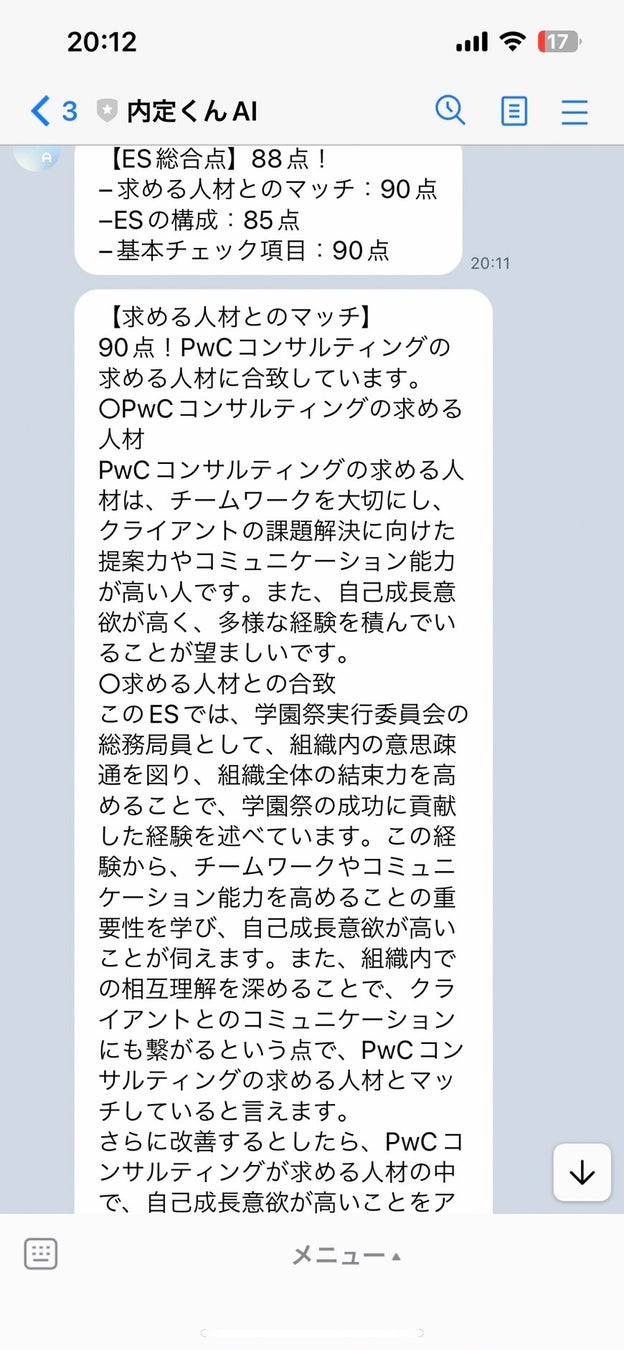 チャットに【企業名】、【設問】、【ESの内容】を送るだけで、以下のような多角的な視点からESの添削をすることができます。