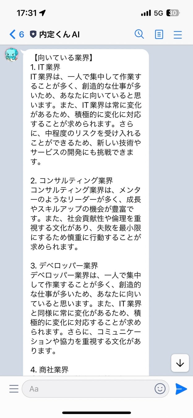 登録したプロフィールやES等を見て、相性が良いと思った企業からLINEにスカウトが届きます。