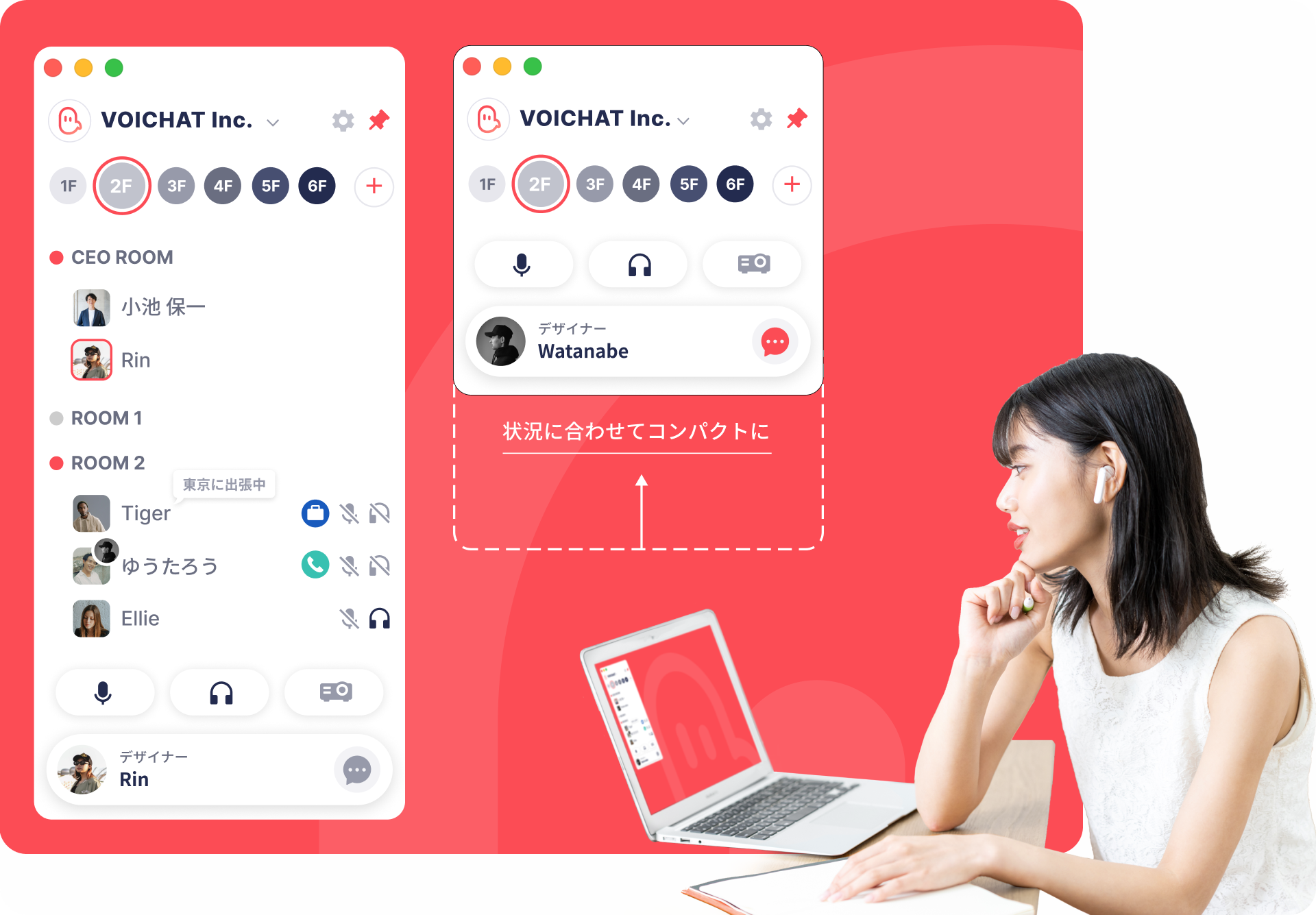 VOICHATは、業務の邪魔をしないコンパクトな縦長オフィスにメンバーのアイコンが並ぶ超ミニマムデザイン。
