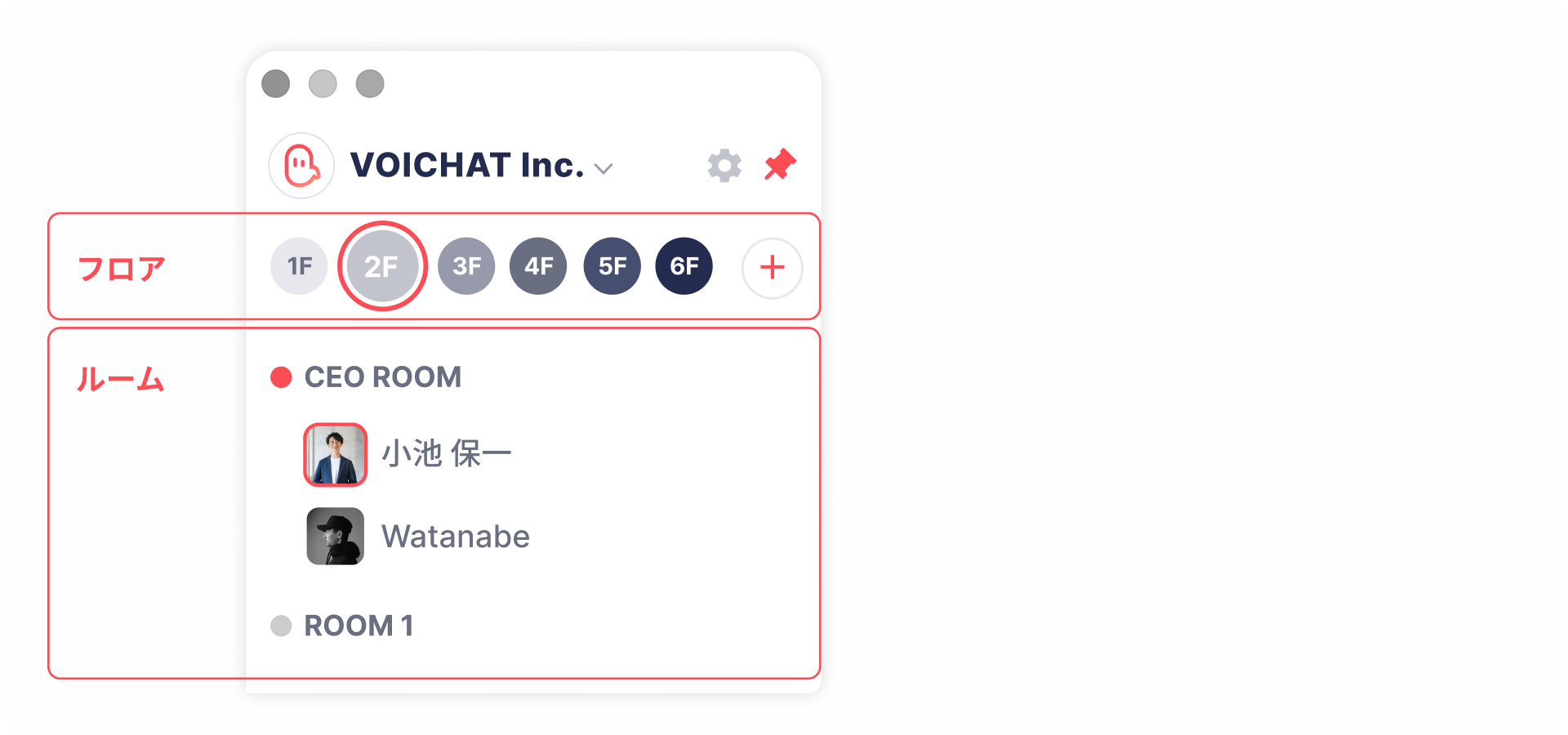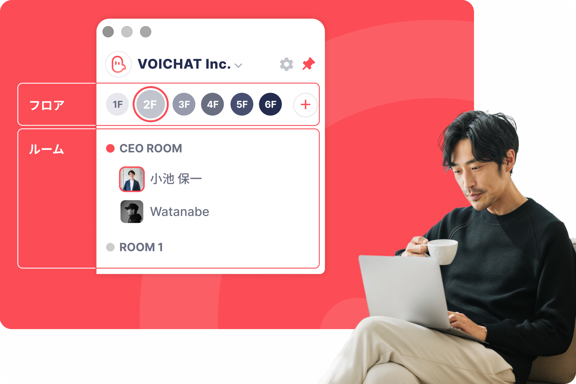 フロア(階層)で事業部を切り分けたり、プロジェクトやタスクに応じてルーム(部屋)を増設したり。VOICHATでは、目的や戦略に応じた体制へオフィスを柔軟にカスタマイズ可能なので、社員の増減や社会情勢に合わせたオフィスの移転や増設は不要になります。