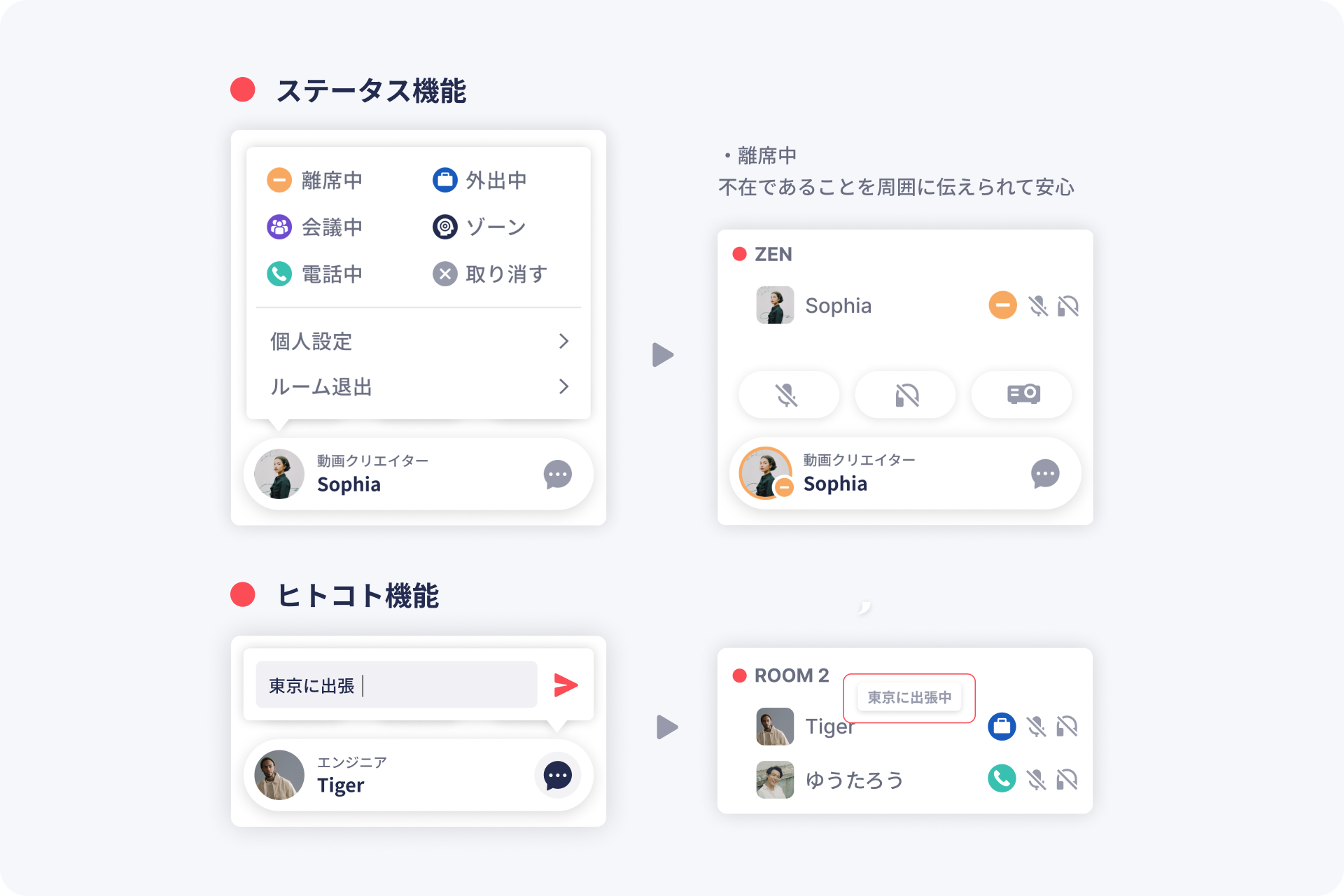 多くのバーチャルオフィスツールが採用している2Dや3Dのオフィスデザインやゲーム要素をあえて排除することで、使うほどに馴染み、利便性を感じられるサステナブルなバーチャルオフィスです。