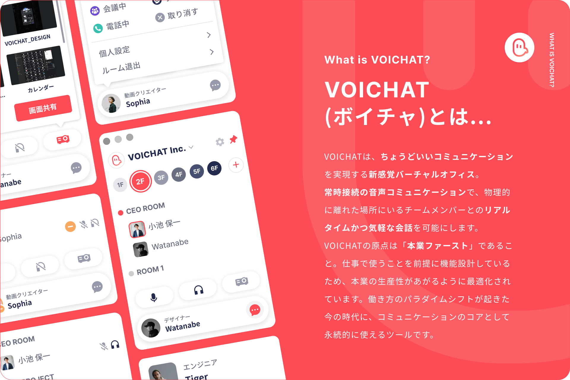 ちょうどいいコミュニケーションを実現する新感覚バーチャルオフィス『VOICHAT』を開発しています。 テクノロジーとアイデアで、シームレスな働き方とボーダーレスな生き方ができる新しい時代を牽引していきます。