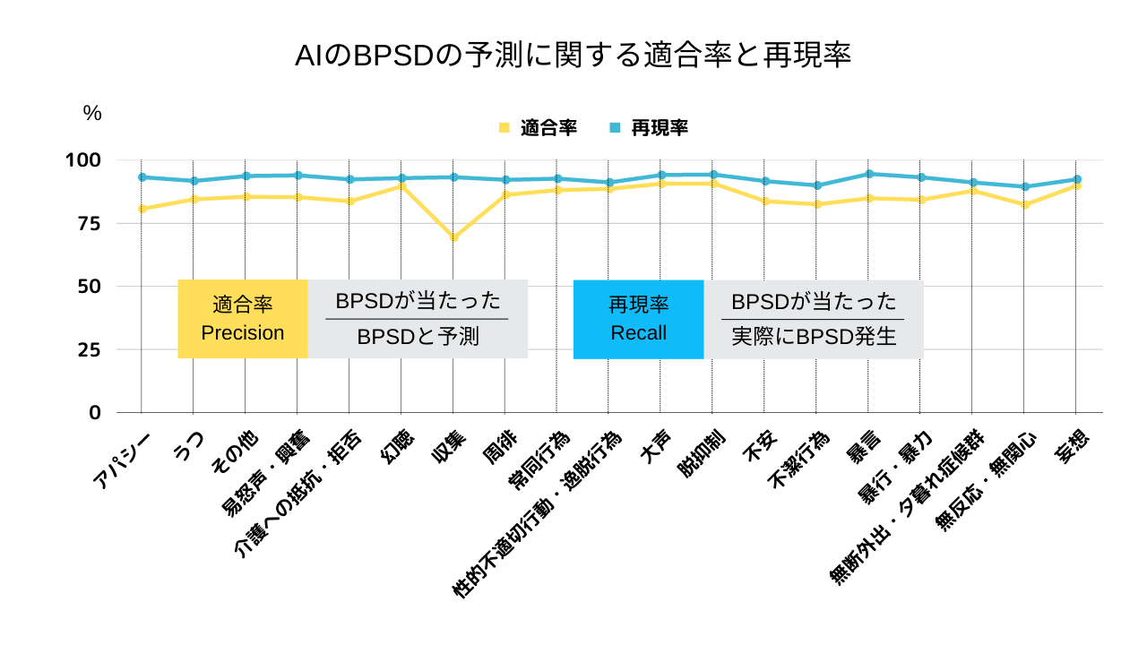 これにより、介護従事者はAIから通知された内容をタブレットで確認し、適切なタイミング・手法で介護ケアを行うことが出来ます。その結果、兆候があったBPSDが発症せず、予防ケアとしての効果が実証されました。尚、実証事業期間内における症状別の予測精度については下図(図2)の通りです。