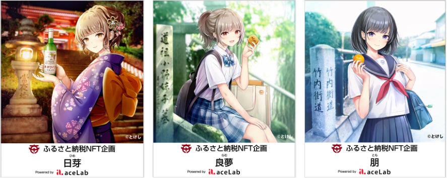 ◆ イラストレーター“とけし”について:質感や光の表現を大切にした、凛として、品のある優しいタッチの女性の絵がSNSでも話題になり、今回はじめてふるさと納税NFTに提供。株式会社aceLab所属。@toke_shi とけ茶房:https://tokesabo.com/