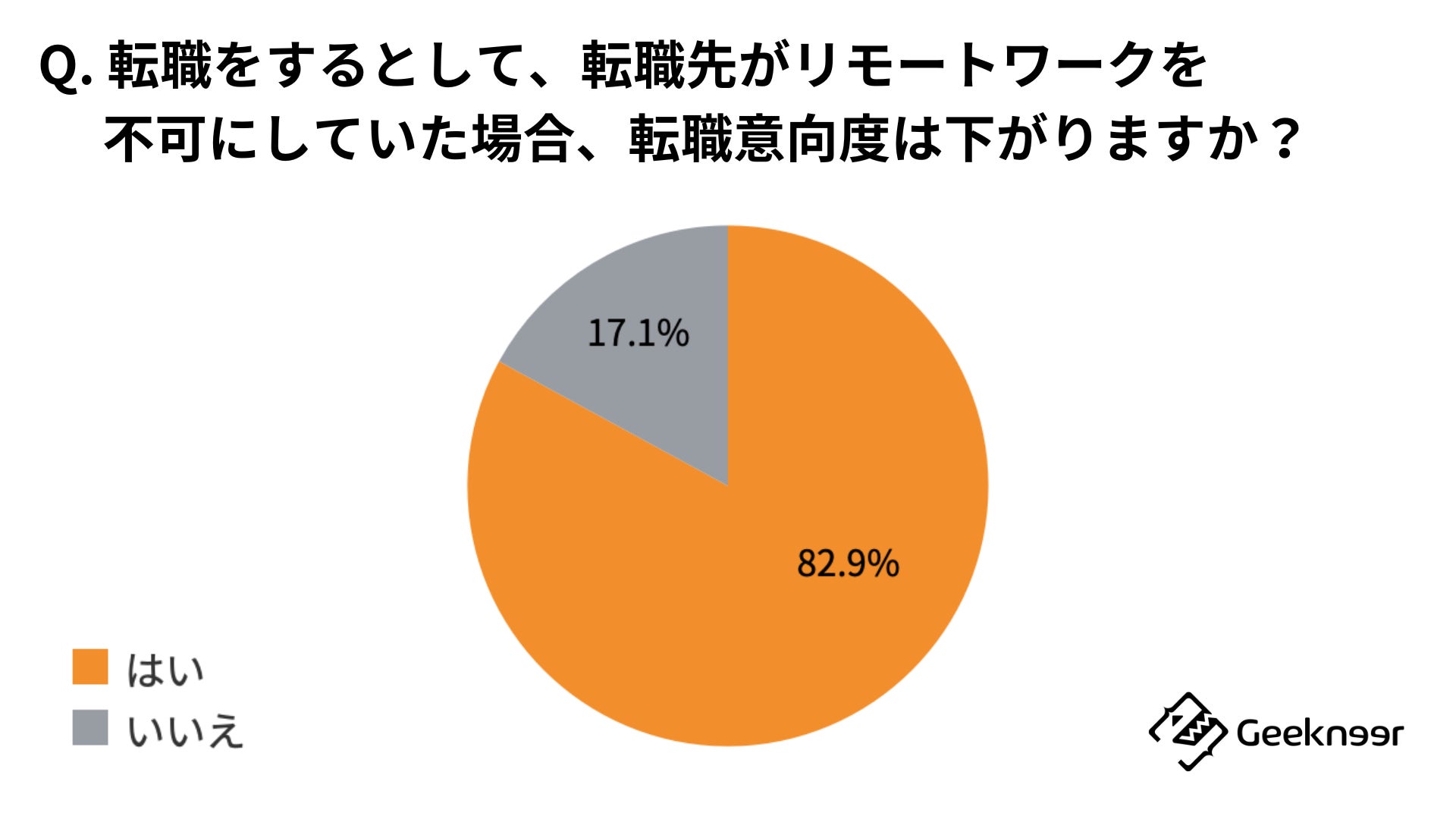 「Q. 転職をするとして、転職先がリモートワークを不可にしていた場合、転職意向度は下がりますか?」の質問では、8割のITエンジニアが「はい」と回答しました。