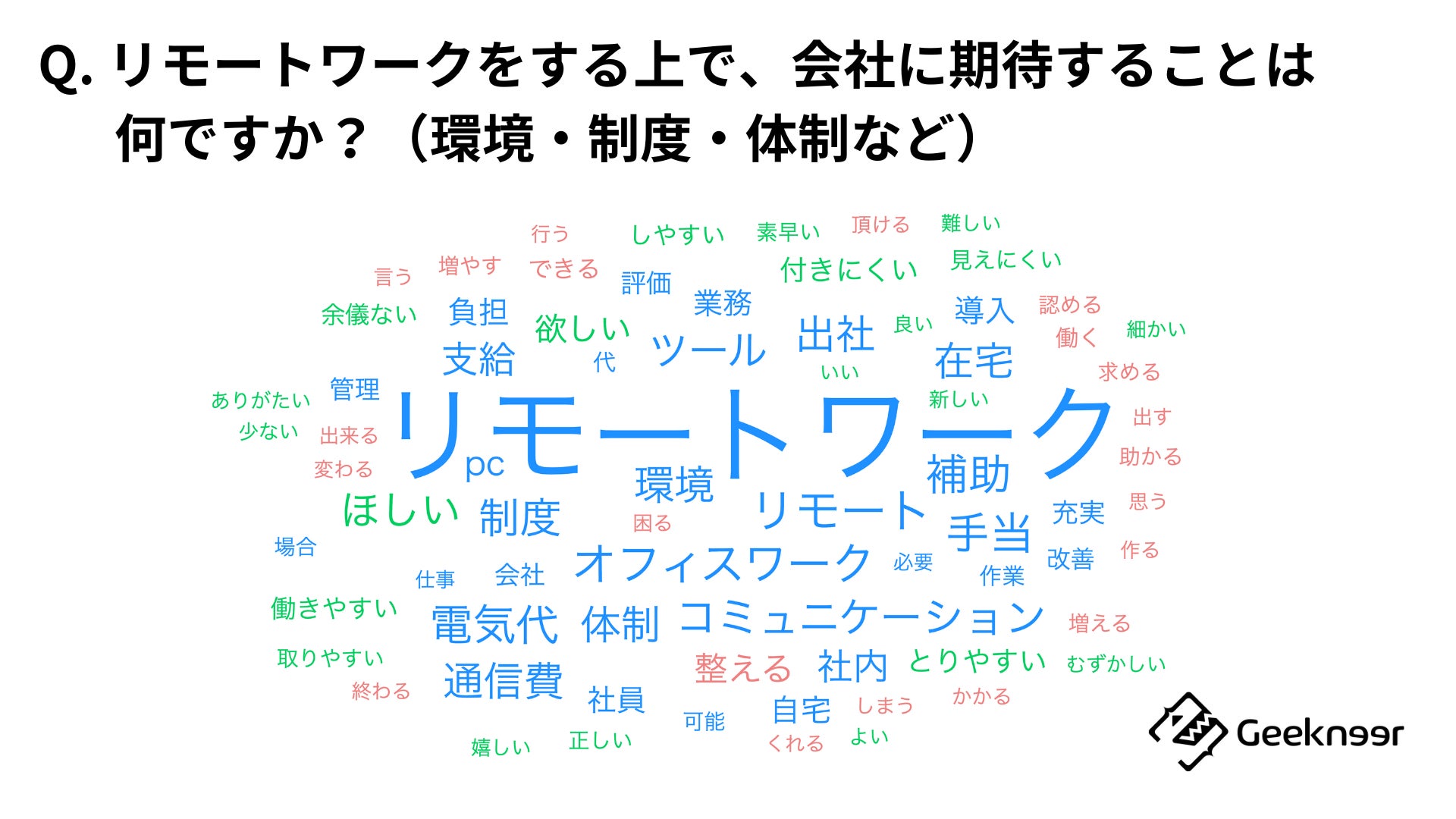 「Q. リモートワークをする上で、会社に期待することは何ですか?(環境・制度・体制など)」の質問では、①リモートワーク補助・手当 ②柔軟な勤務形態・制度 ③円滑なコミュニケーションができる仕組み ④評価・管理体制の適正化 についてのコメントが多く挙げられました。
