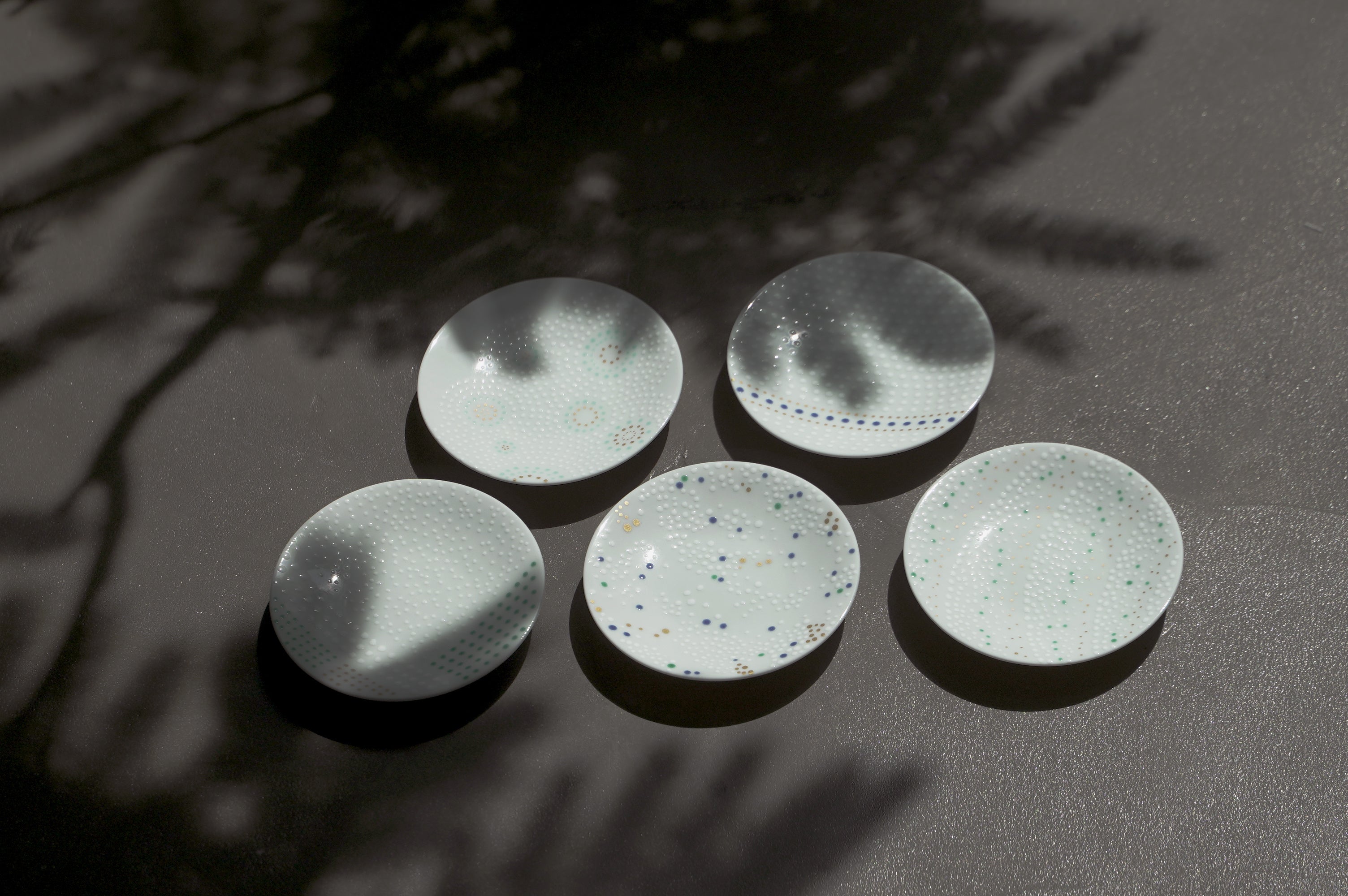 雨が降り、石を穿ち、留まり、流れる情景を、九谷焼の白粒技法を用いたリズミカルなドット柄で表現しました。