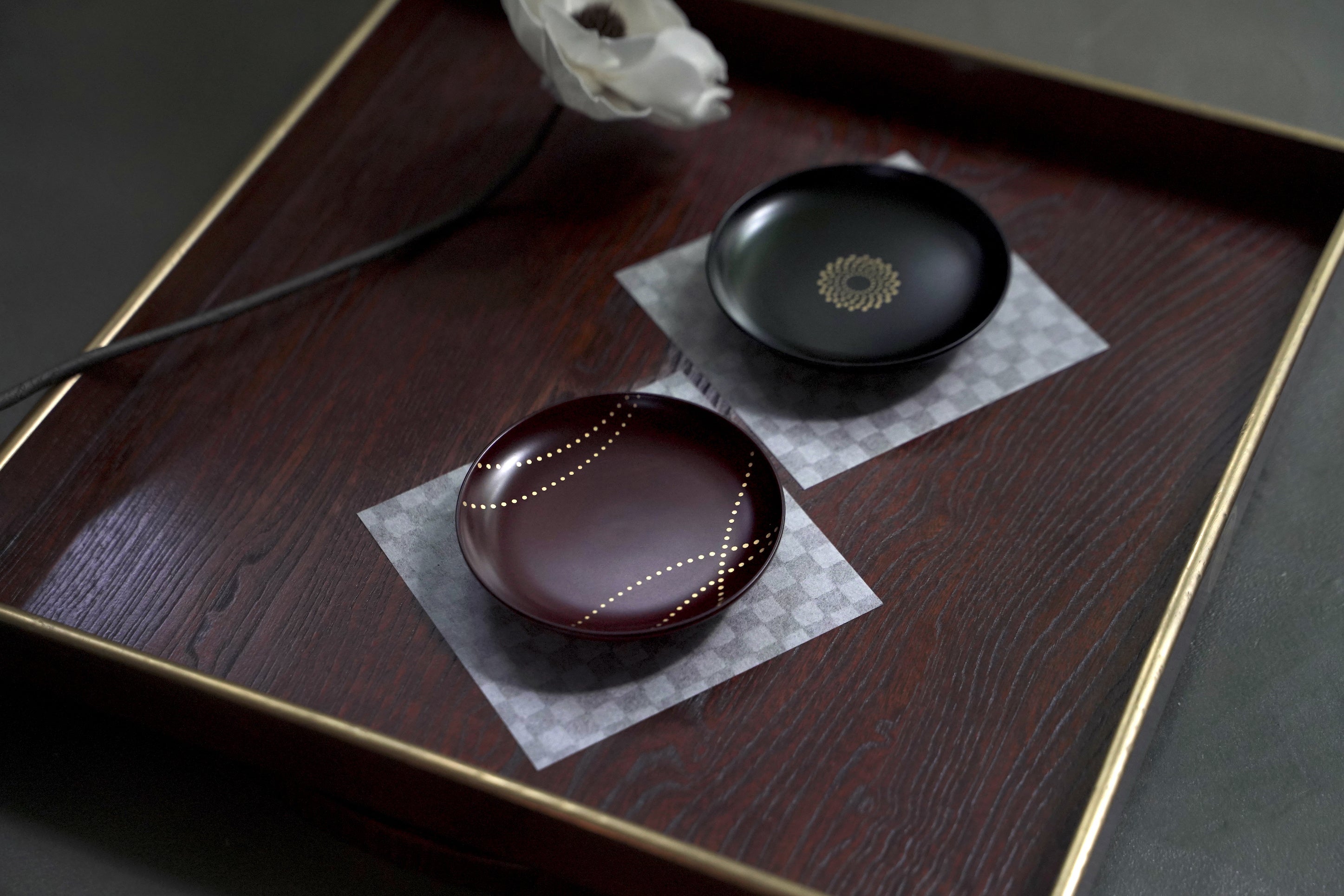漆器の深い色合いに金箔のドット柄で華やかさを加えたデザインです。