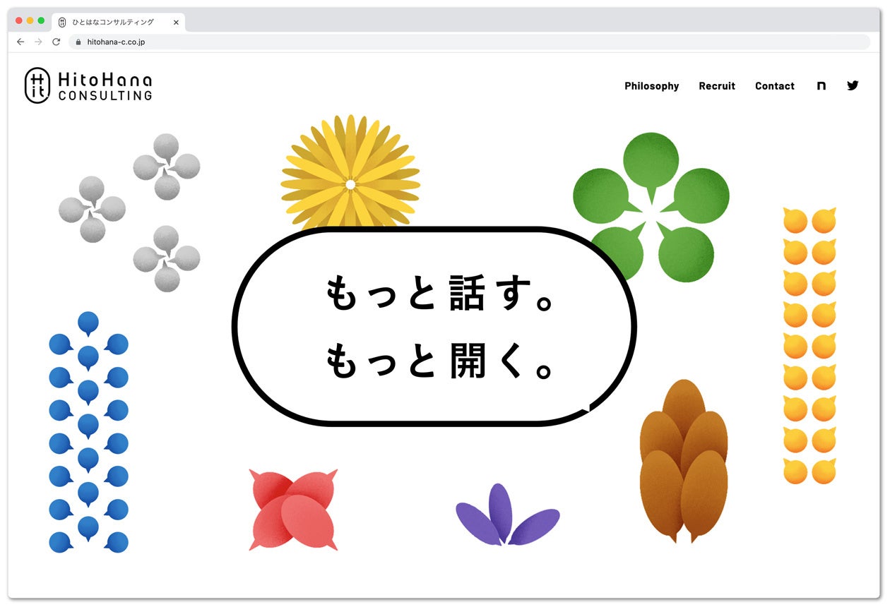コーポレートサイトでは“人と話す”というコンセプトをベースに、吹き出しをモチーフとしたグラフィックを用いて企業の想いを視覚的に表現した。( https://hitohana-c.co.jp )