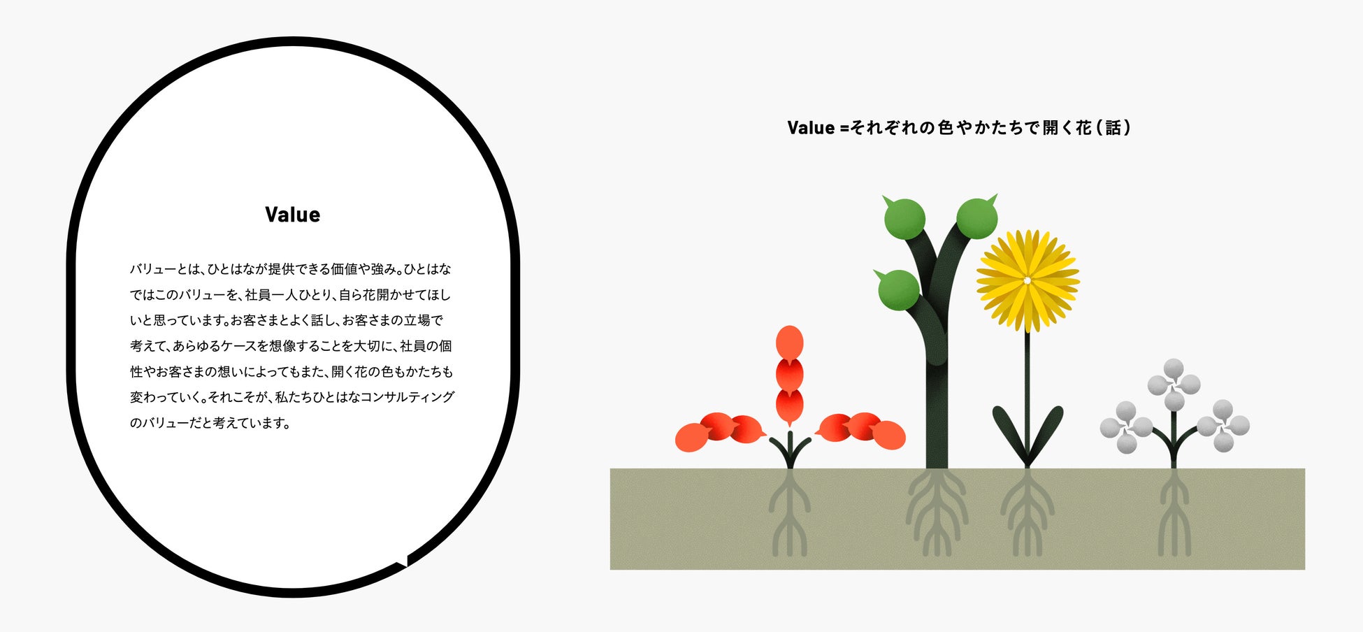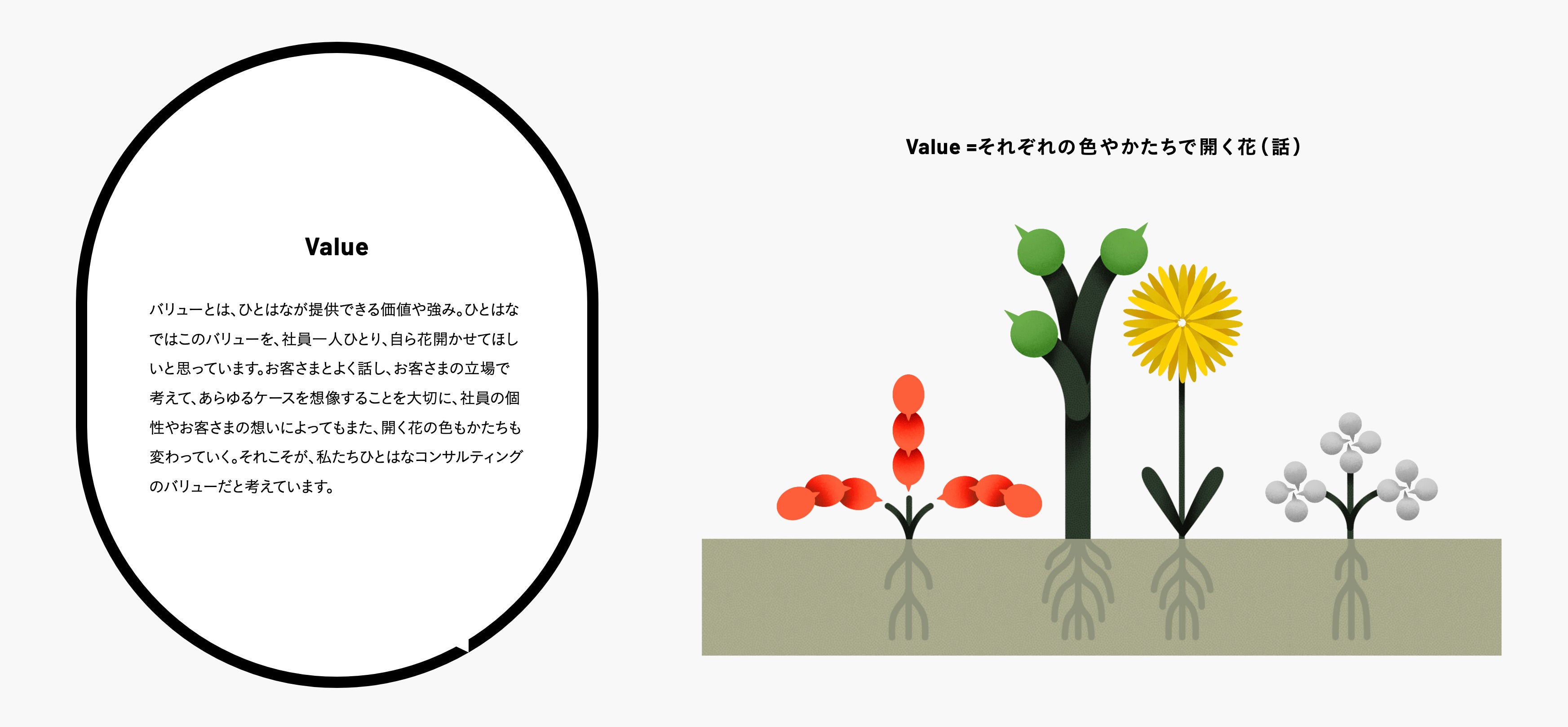 約1年ほど対話を重ねながら、企業の核となるミッションやビジョンなどの言葉の開発や、ロゴなどのデザインの開発を通して、“ひとはなコンサルティング”という人格の元をつくってきました。今回のリブランディングを起点に、より多くの人々にひとはなコンサルティングを知っていただくとともに、その活動のファンになってもらえるようなブランドへと育てていくべく、これからも共創を続けていきたいと思っています。