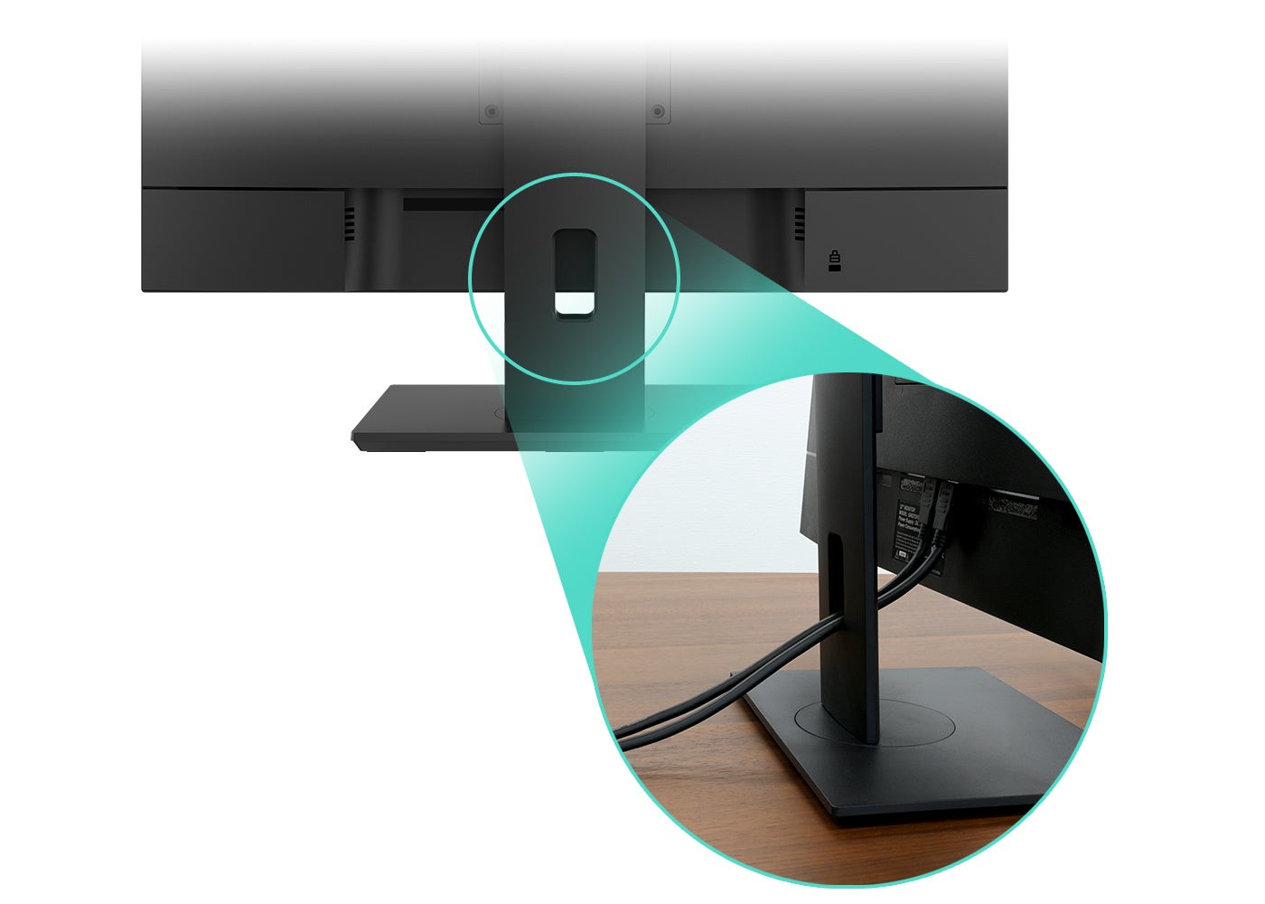 接続したケーブルは、スタンドのケーブルホールを通してスッキリとまとめることができます。デスク周りの整理にも一役買います。
