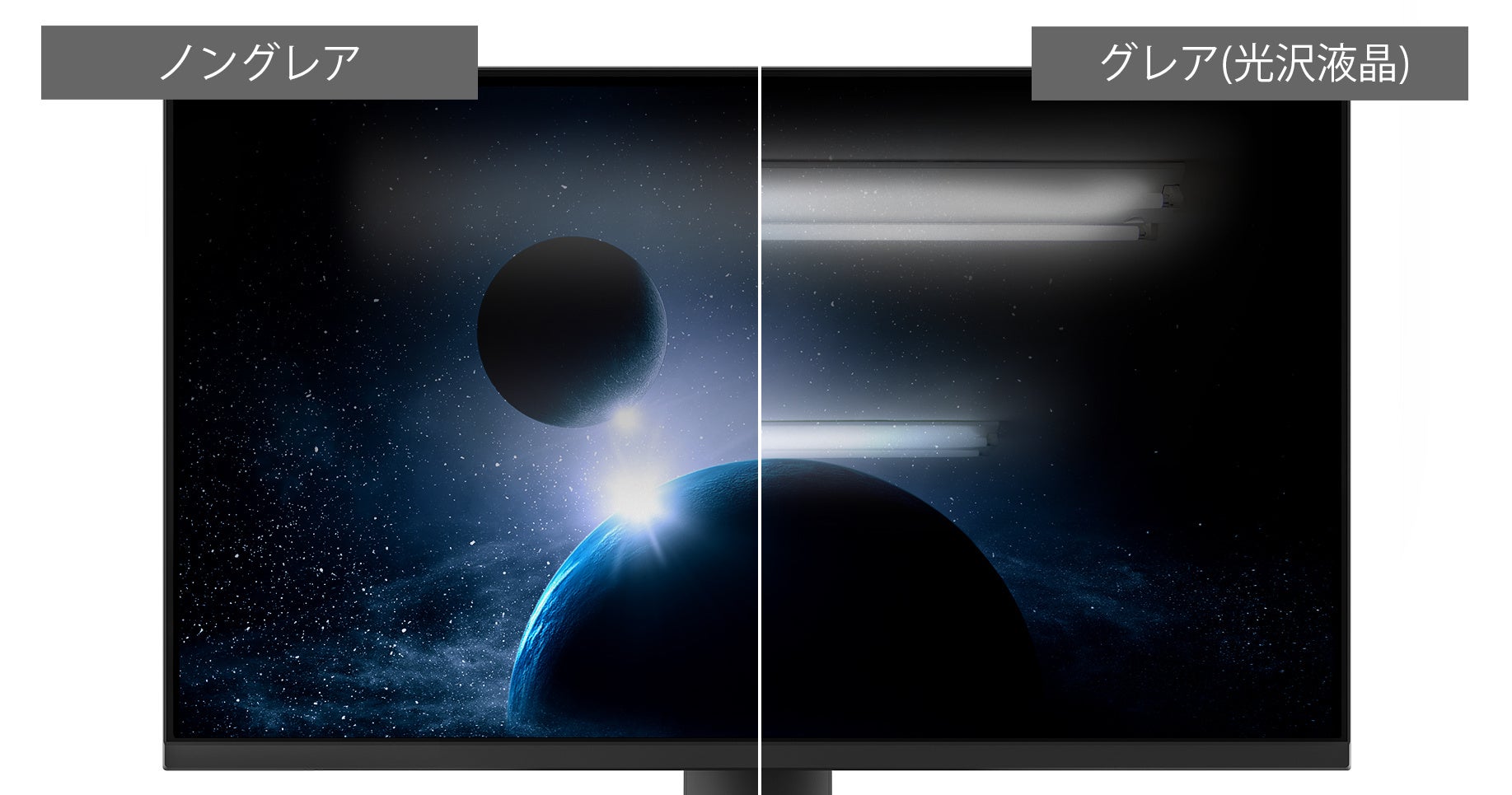 一般的なスマホやタブレットに使用される「光沢液晶」よりも、「ノングレア液晶」は外光の映り込みや、蛍光灯などの光が反射するのを防ぎます。光の刺激を分散、緩和させるので長時間の使用に適しています。