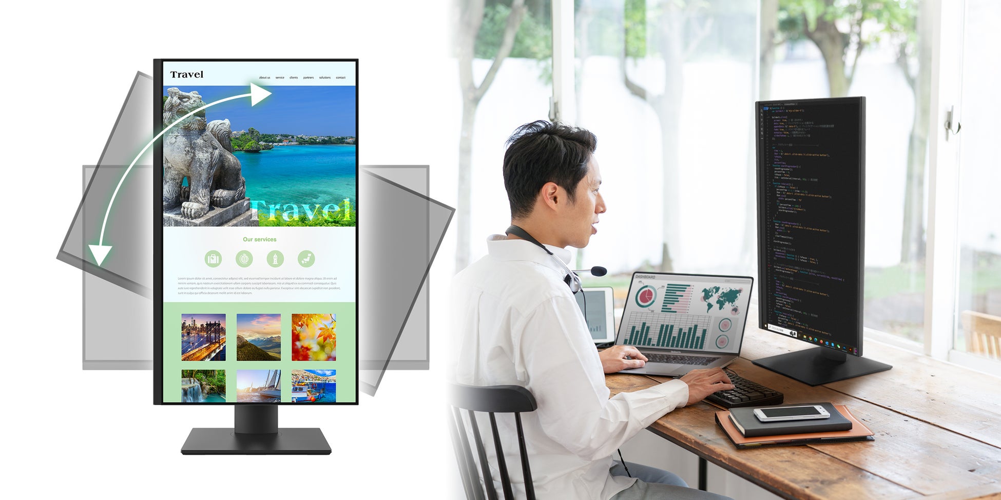 右90°の画面回転に対応。縦方向の情報量が一度に多く表示されるので、スクロールせずに長文やソースコードの編集作業、WEBサイトの閲覧などが可能です。