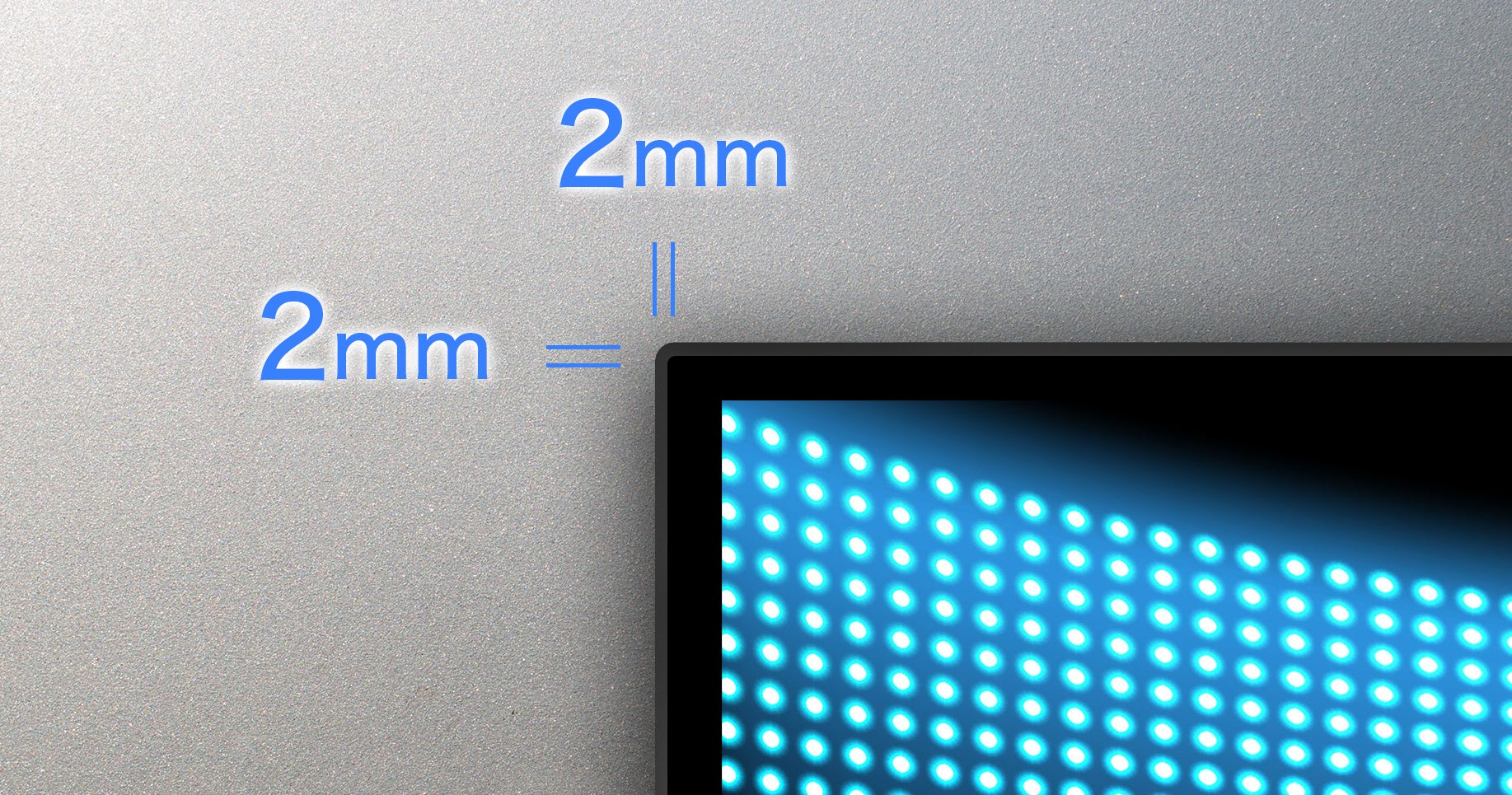約2mmのスリムベゼルでシャープなデザイン。デュアルモニターにも最適です。