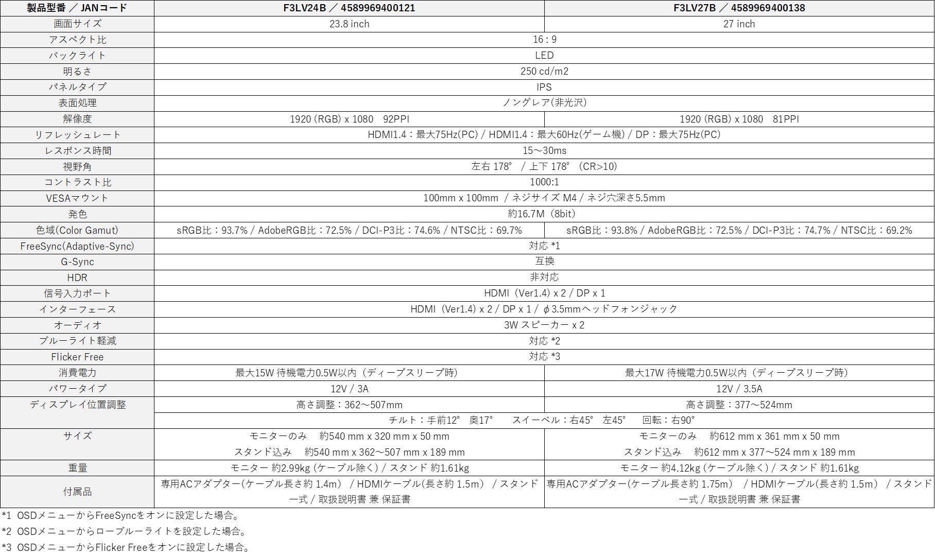 フルHD液晶モニター 「F3LV27B」「F3LV24B」販売開始のお知らせ