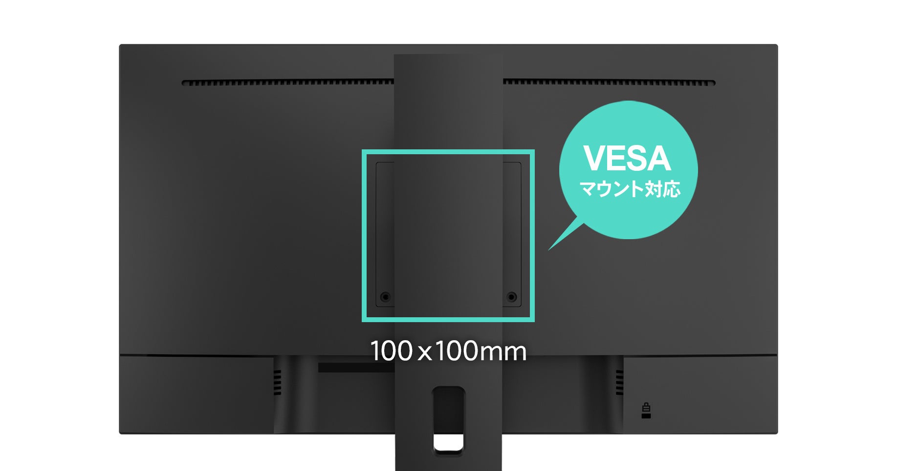背面に100×100mmのVESA規格に準じたネジ穴を備え、モニターアームや壁掛け設置にも対応しています。