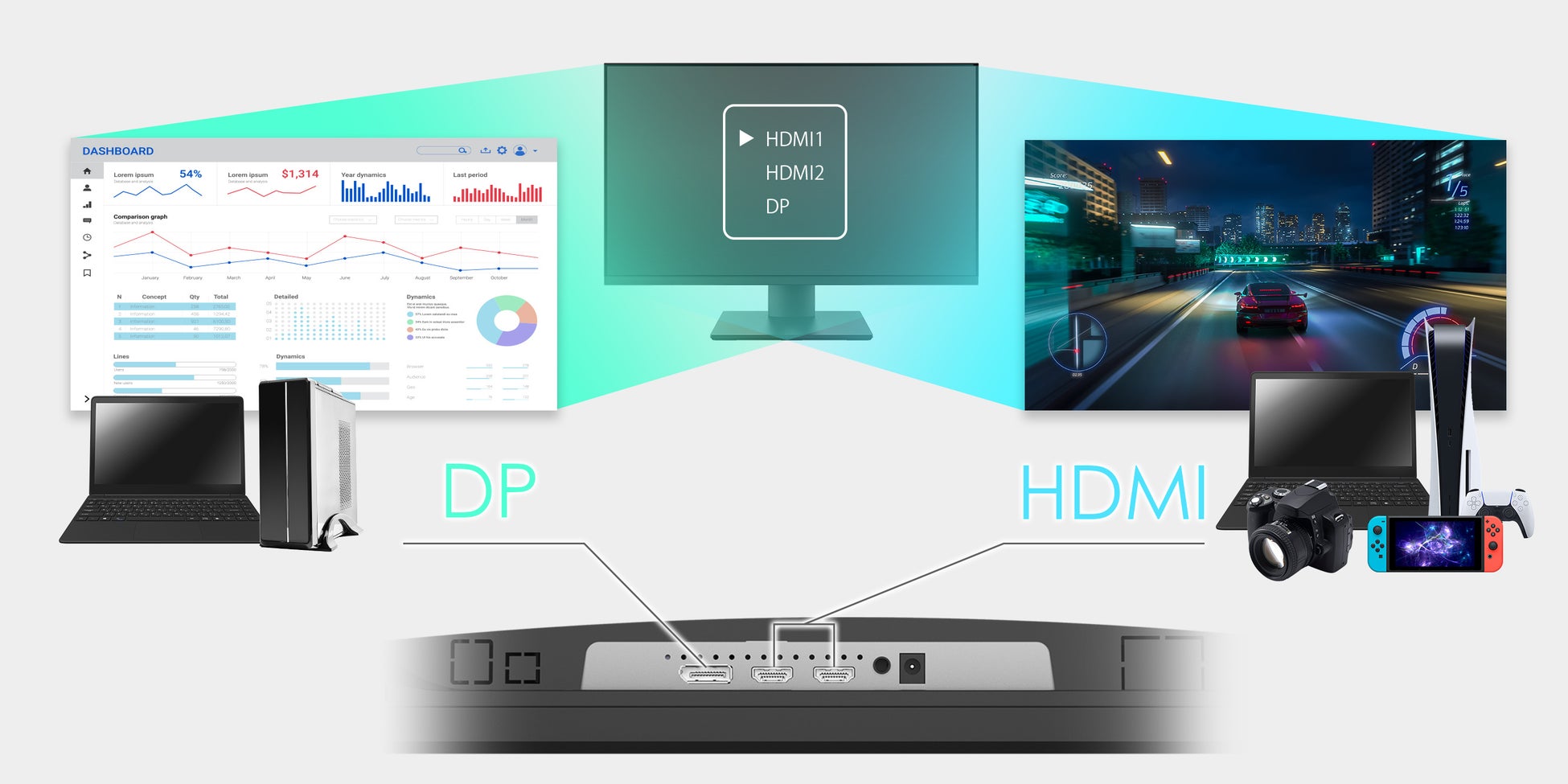 DP x 1ポート、HDMI(ver1.4) x 2ポートを搭載。ゲーム機やパソコンなどを最大3台同時に接続できます。モニター側の機能で入力信号を切り替えて映し出すことが可能なので、接続機器を変えたい時にケーブルを抜き差しするわずらわしさがありません。