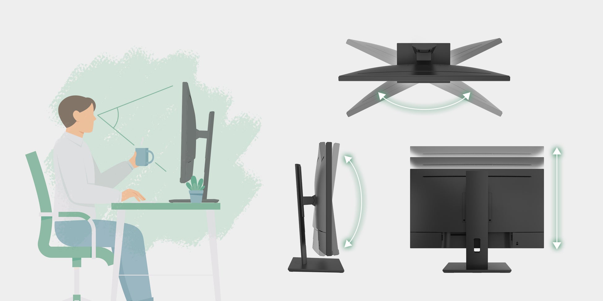 DP、HDMIの2系統のポートを搭載し、PCやゲーム機など幅広い機器に接続できます。さらに、高さや角度が細かく調節できるスタンドが体に負担のかからない姿勢をサポート。目を労わるアイケア機能も豊富に備えた、長時間でも快適に使用できるモニターです。