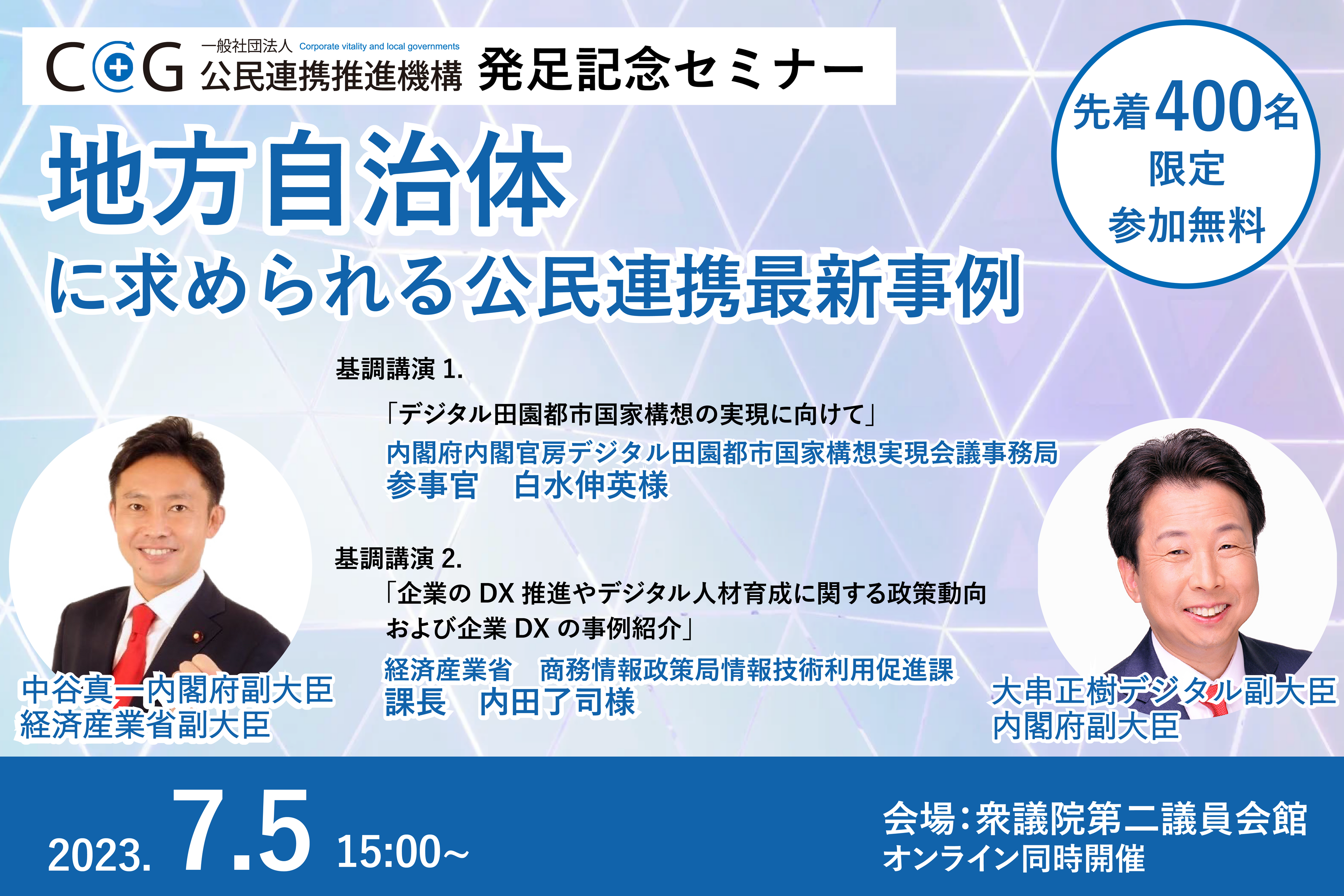 国や⺠間企業の活力や資金を活用して地方自治体の活性化を目的に設立された「⼀般社団法⼈公⺠連携推進機構」が令和5年7⽉5⽇に衆議院第二議員会館において「公⺠連携推進機構発⾜セミナー」を開催。