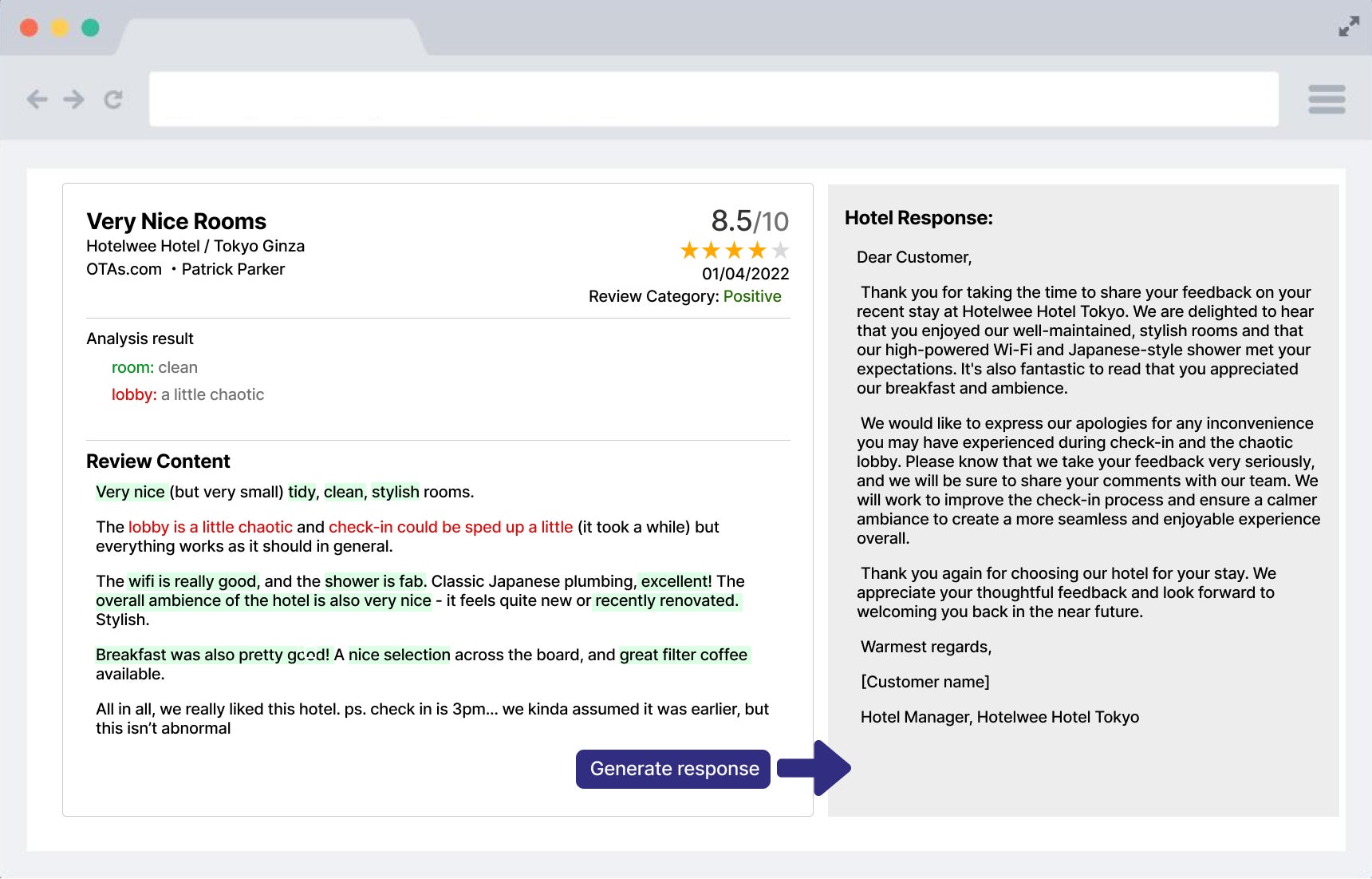 宿泊事業者の課題を解決するため、Hotelweeでは、収集した顧客レビューを「API(アプリケーション・プログラミング・インタフェース)」と呼ばれる技術でChatGPTと連携し感情分析することで、旅行サイトの口コミへの回答を多言語で自動生成したり、口コミに基づく改善点を自動提案できるようにしました。