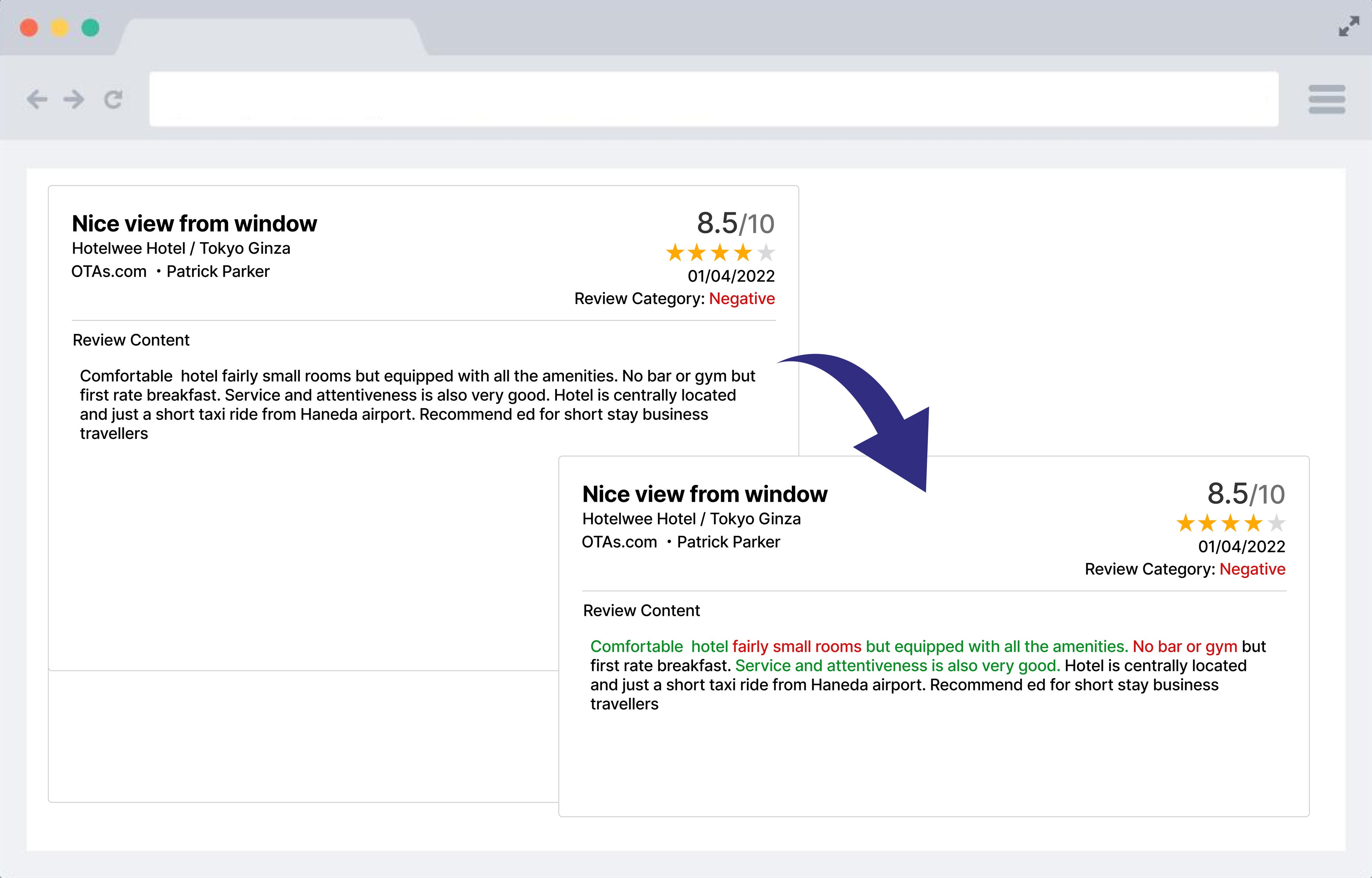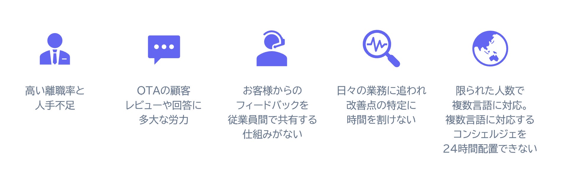 インバウンド需要が高まる中、世界中から訪日する宿泊客の評判(レピュテーション)管理は、ホテルのイメージ向上やネガティブな評判の回復を図るうえで重要性を増しています。その一方、ホテル・旅行業界は人手不足で多言語に対応できる選任担当者を十分に置けていません。またホテルの従業員は、複数のオンライン旅行サイトで宿泊客のクチコミ対応に、多くの労力を費やしています。更に全ての旅行サイトのクチコミを相対的に分析することが困難なため、顧客満足度を総合的に判断することが課題でした。