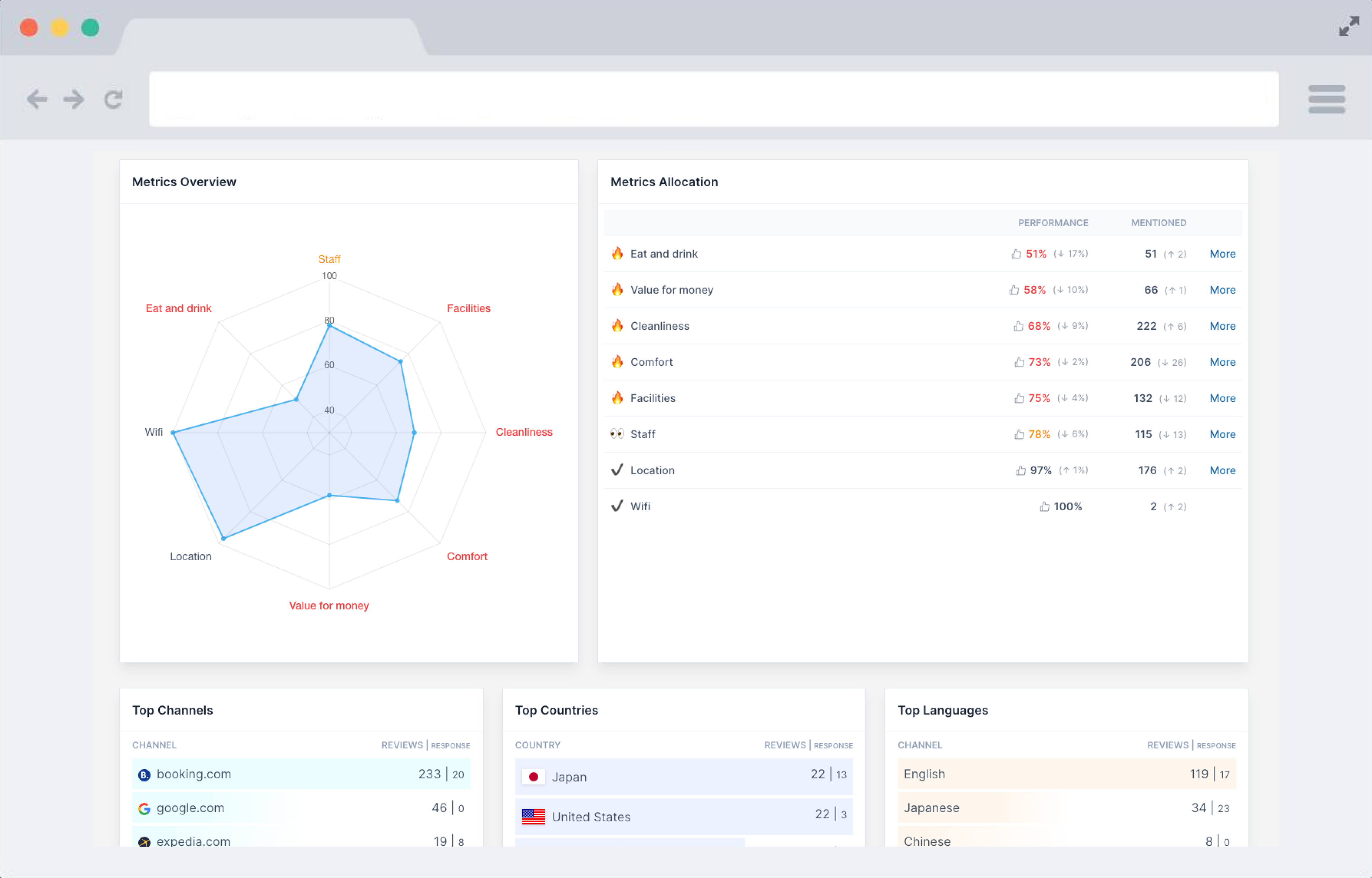 複数のオンライン旅行サイトからクチコミを収集します。ホテルの従業員は、1つのツールで全てのクチコミにフィードバックすることができます。多言語サポート