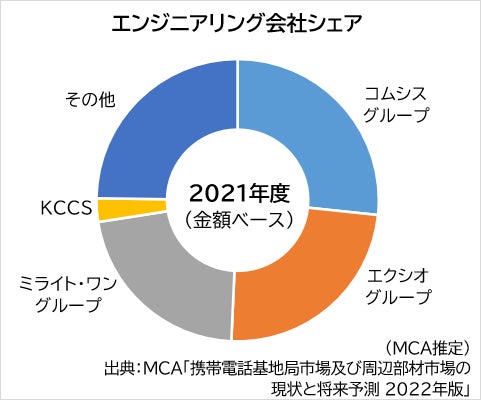 2021年度の基地局向けエンジニアリング市場は全国系大手エンジニアリング会社3社が72.5%のシェアを獲得した。最大手はコムシスグループで、エクシオグループ、ミライト・ワングループと続く。コムシスホールディングスは日本コムシスやサンワコムシスエンジニアリング、TOSYS、つうけん、NDS、SYSKEN、北陸電話工事を、エクシオグループがシーキューブや西部電気工業、日本電通、大和電設工業、エクシオテックを、ミライト・ワンは旧ミライトや旧ミライト・テクノロジーズを統合し、TTKやソルコム、四国通建を抱える。