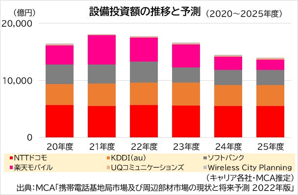 2022年度はNTTドコモが5,630億円、KDDI(au)は4,000億円、ソフトバンクが3,700億円、楽天モバイルは4,190億円、UQCが150億円、WCPは100億円の合計1兆7,770億円を見込む。楽天モバイルの大型投資が続き、その規模はKDDI(au)とソフトバンクを凌ぐ規模になっている。