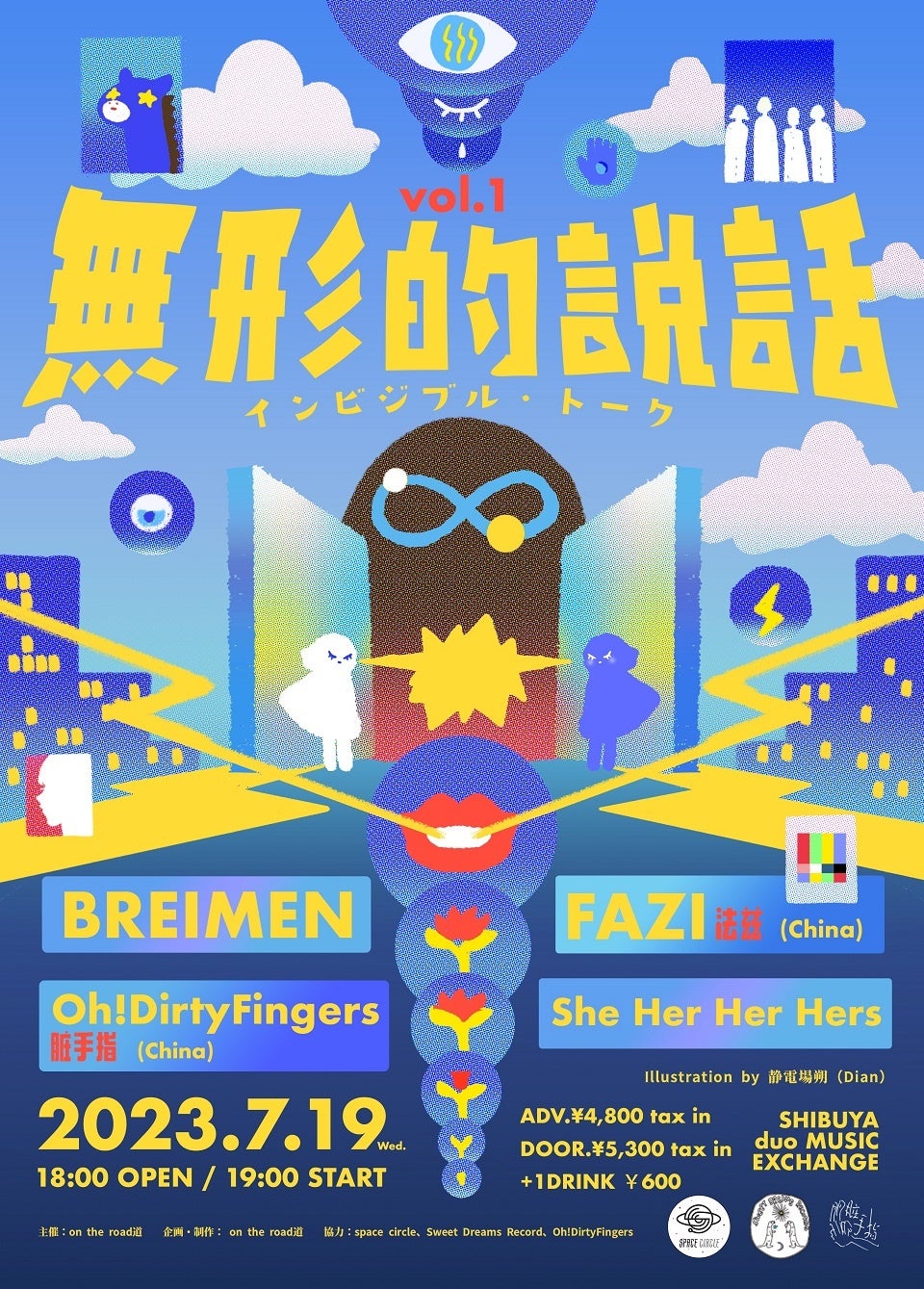 日本からは、中国でも絶大な人気を誇るオルタナティブバンド「She Her Her Hers」と高い演奏力と自由にジャンルを横断する音楽性でいま人気急上昇中のミクスチャーファンクバンド「BREIMEN」の二組が出演。記念すべき第1回目の開催!イベントのキービジュアルを手かけたのは、今東京在住、中国・北京出身の人気マルチクリエイター【静電場朔(Dian)】。