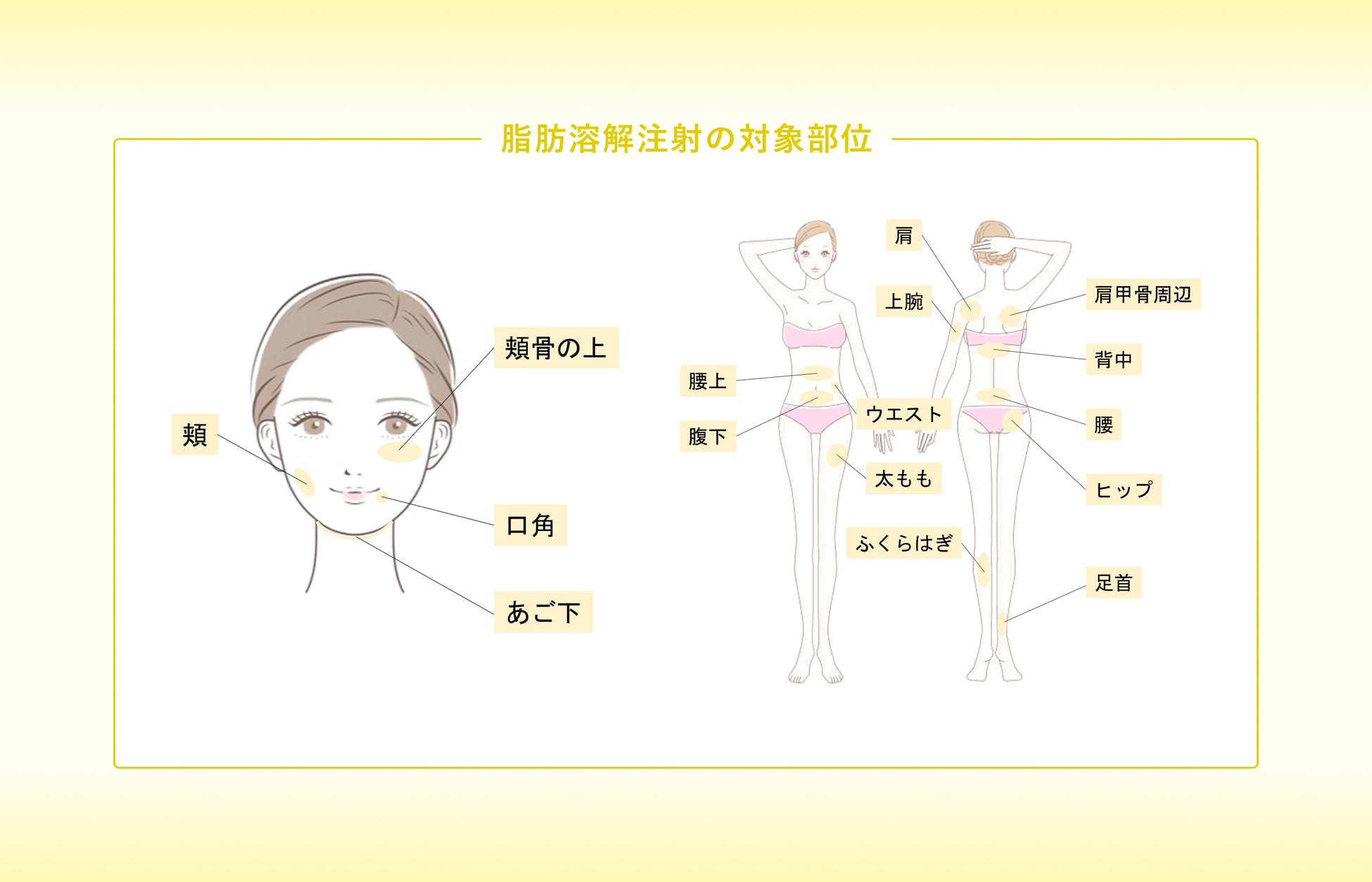 脂肪溶解注射は部分痩せを叶える注入治療です。脂肪の溶解や脂肪細胞の破壊ができる有効成分を含んだ薬剤を気になる部位へ直接注射することで、脂肪細胞自体を破壊し、痩せる効果を出す施術です。ダイエットでは痩せにくいと言われている二重アゴやフェイスラインなどの部分痩せに効果的であり、全身痩せ出なく部分てきに痩せたい方に特にお勧めです。脂肪溶解注射は、注射のみで行う治療のため、切開を伴う痩身施術と比べてもダウンタイムが少なく済みます。