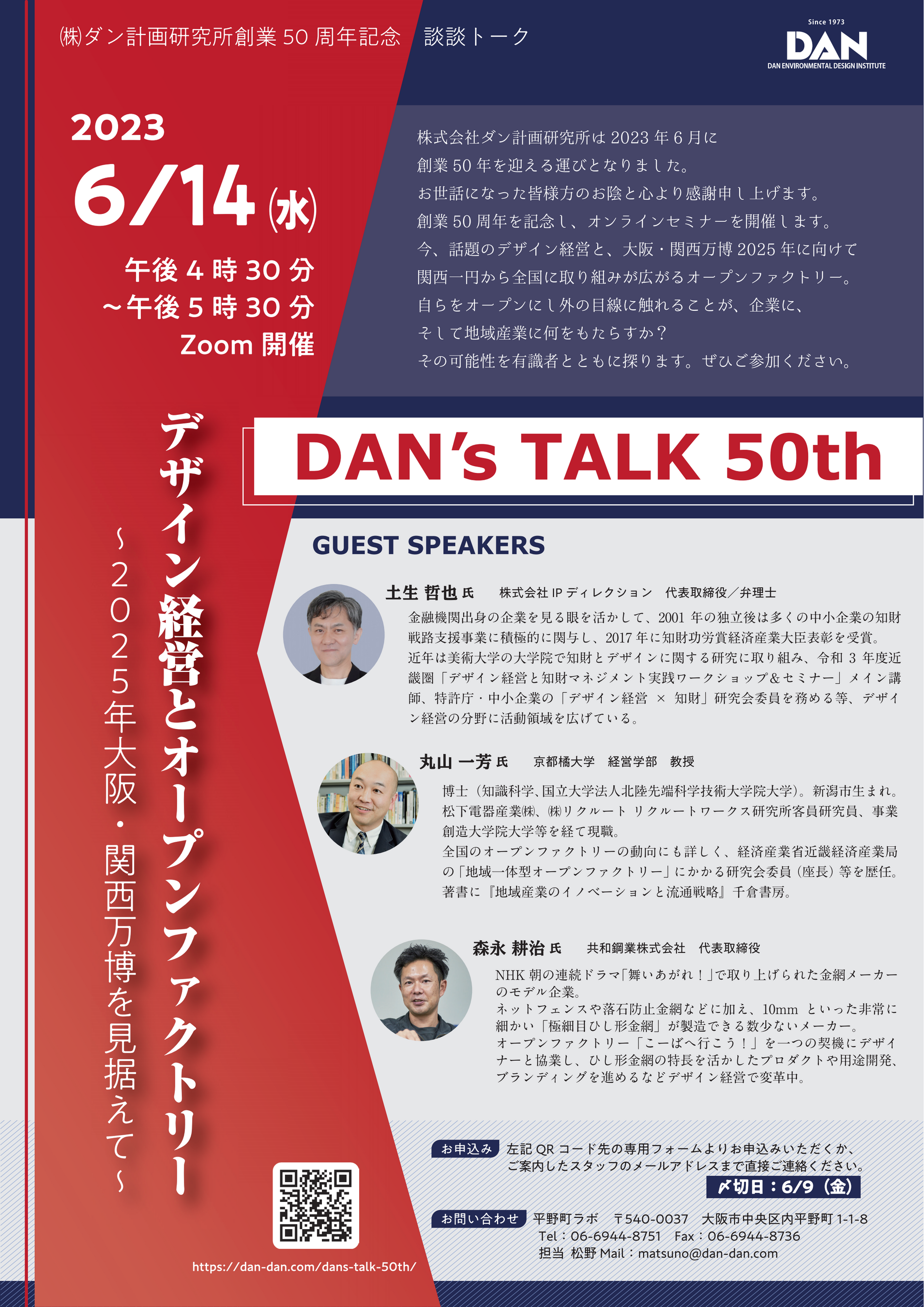 2023年6月14日(水)に弊社は創業50周年を迎え、記念事業としてオンラインイベント「デザイン経営とオープンファクトリー~2025年大阪・関西万博を見据えて~」を開催いたします。