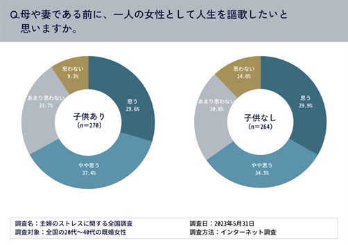 「思う・やや思う」と答えた人は、子供がいる既婚女性が67.0%、子供がいない既婚女性が64.4%と3人に2人が「母や妻である前に、一人の女性として人生を謳歌したい」と考えていることがわかった。
