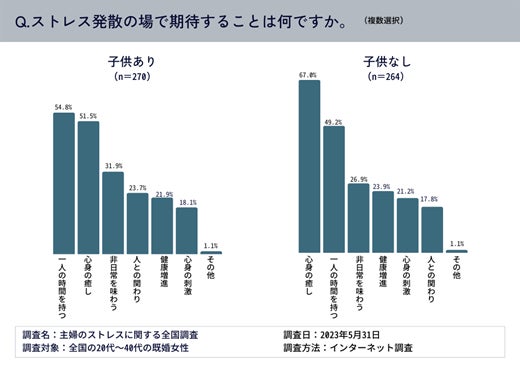 ストレス発散の場で期待することを聞いたところ、子供がいる既婚女性は「一人の時間を持つ(54.8%)」、子供がいない既婚女性は「心身の癒し(67.0%)」が第1位だった。「非日常を味わう」が3位となり、日常生活を忘れて、非日常を味わい、心身を癒したいと考える人が多いことがわかった。