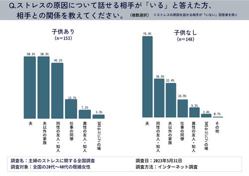 前問でストレスの原因について話せる相手が「いる」と答えた人に対して、相手との関係を聞いたところ、子供がいる既婚女性は、「夫」と「夫以外の家族」が50.3%で同率1位だった。子供のいない既婚女性は「夫」が76.4%で他に大差をつけて第1位だった。