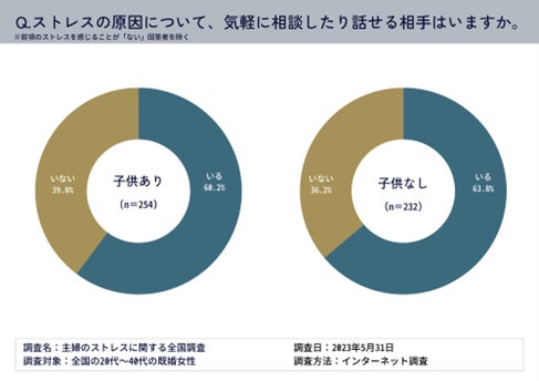 調査の結果、既婚女性の大半が普段の生活でストレスを感じており、発散したいと考えているものの、その時間や機会に恵まれておらず、4割の人がストレスについて気軽に話せる相手がいないことがわかりました。