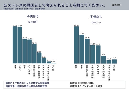 ストレスの原因として考えられることについて、子供がいる既婚女性は、第1位が家事(57.9%)、続いて僅差で子育て(57.1%)が第2位だった。子供のいない既婚女性のストレスの原因は、第1位が仕事(48.3%)で、第2位が家事(37.5%)だった。