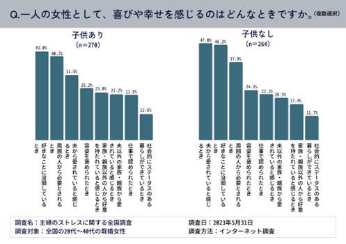 子供がいる既婚女性は、第1位「好きなことに没頭しているとき(43.0%)」、第2位「周囲の人から必要とされるとき(40.7%)」、第3位「夫から愛されていると感じるとき(31.5%)」という結果だった。子供がいない既婚女性は、第1位「夫から愛されていると感じるとき(47.0%)」、第2位「好きなことに没頭しているとき(46.2%)」、第3位「周囲の人から必要とされるとき(37.9%)」だった。