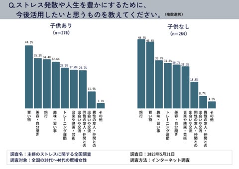 ストレス発散のために活用したいと思うものを聞いたところ、子供がいる既婚女性は、第1位「買い物(44.1%)」、第2位「美容・自分磨き(35.2%)」、第3位「旅行(34.4%)」だった。子供がいない既婚女性は第1位「旅行(48.5%)」、第2位「買い物(46.6%)」、第3位「趣味・習い事(33.7%)」だった。