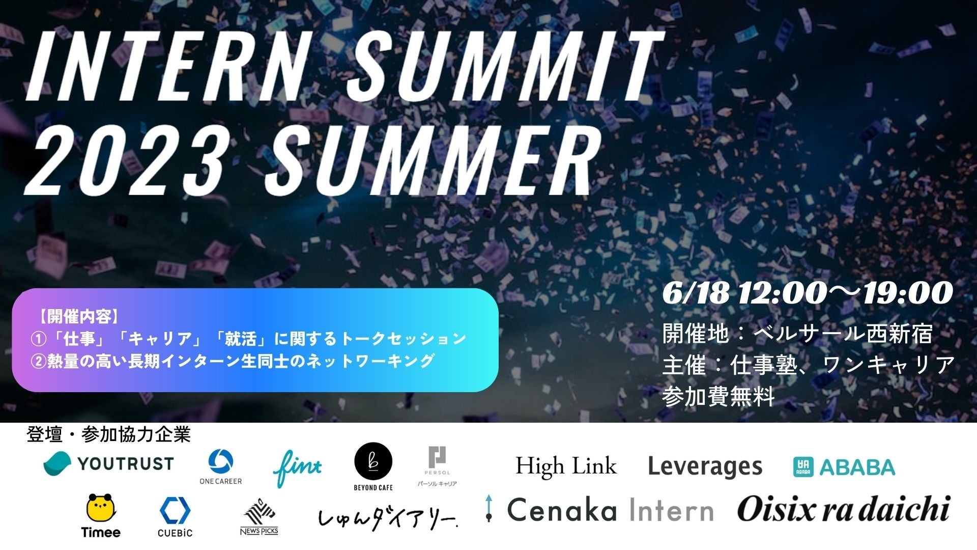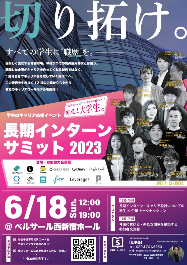 『仕事塾』(運営会社:good luck株式会社、代表:高村一光、本社:東京都渋谷区)はワンキャリアやNewspicksなど今学生が注目する企業と、全国の挑戦意欲の高い学生を集めた長期インターンサミットを6月18日(日)に西新宿にて開催します。