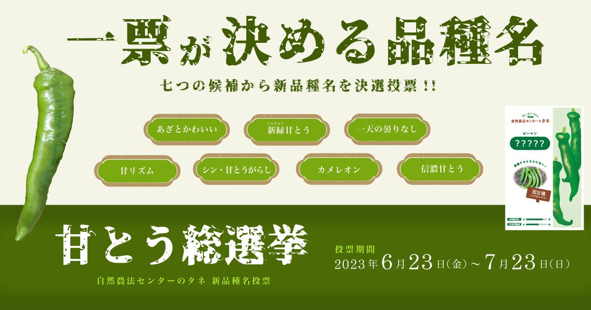 7/23(日)まで投票受付中 !! 抽選で5名様に野菜セットプレゼント『甘とう総選挙』(国産・農薬不使用のタネ 新品種ネーミングキャンペーン)