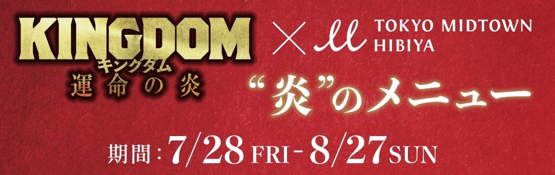 東京ミッドタウン日比谷×映画『キングダム 運命の炎』コラボキャンペーン期間中にTOHOシネマズ 日比谷で鑑賞された映画『キングダム 運命の炎』の当日チケット(鑑賞前のチケットも有効)またはWeb購入時の画面をご提示の上、対象店舗で運命の炎にちなんだ、夏の熱気を高めるホットな”辛い・赤いメニュー”を食べた方にお得なサービスを実施いたします。