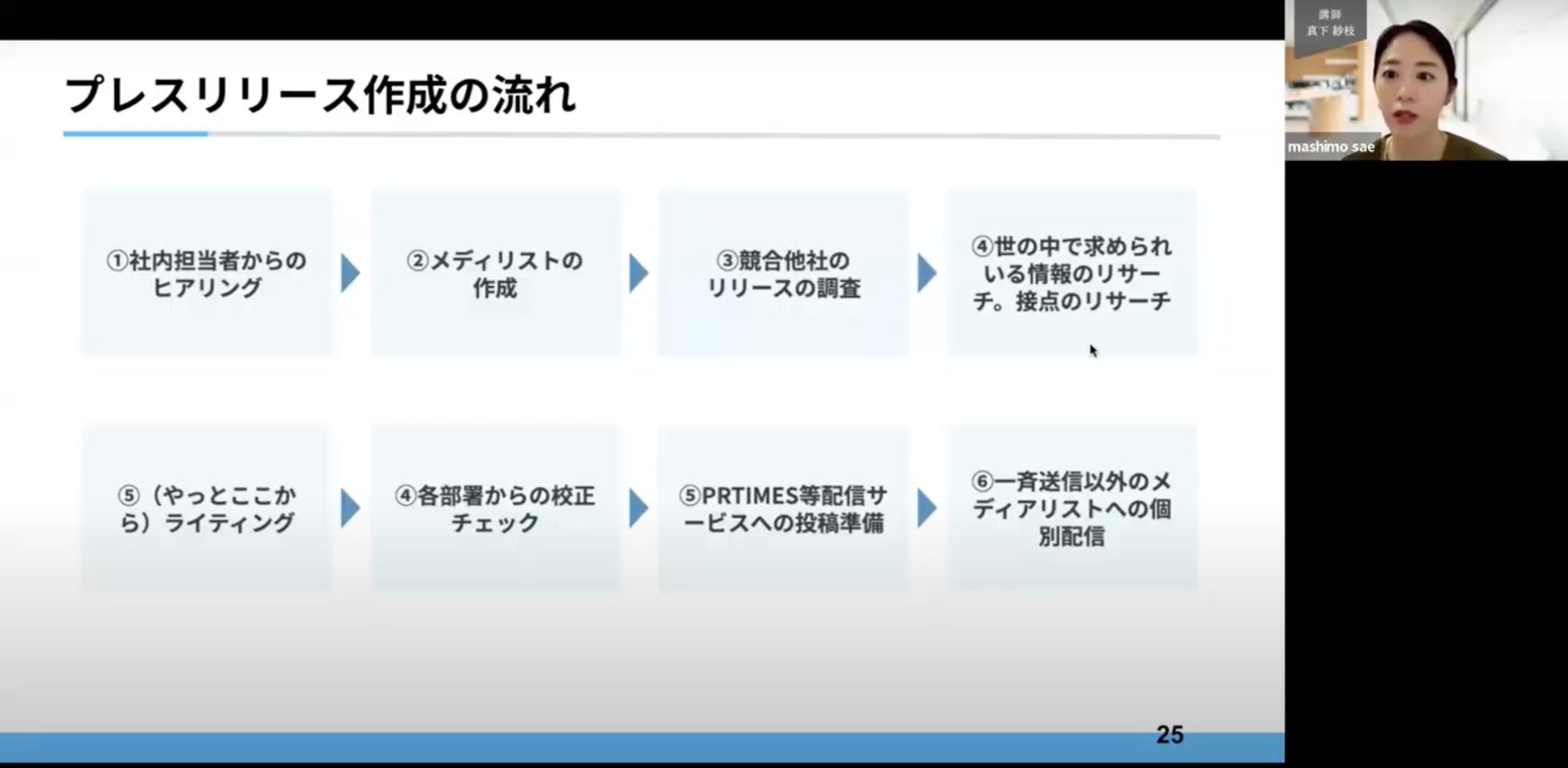 ・広報PR:世の中の関心ごとに自社の強みを掛け合わせて企画を設計します。まずは世の中の関心ごとを調査し、企画の切り口を探ります。その企画を元にプレスリリースを作成し、専門家からフィードバックを受けます。